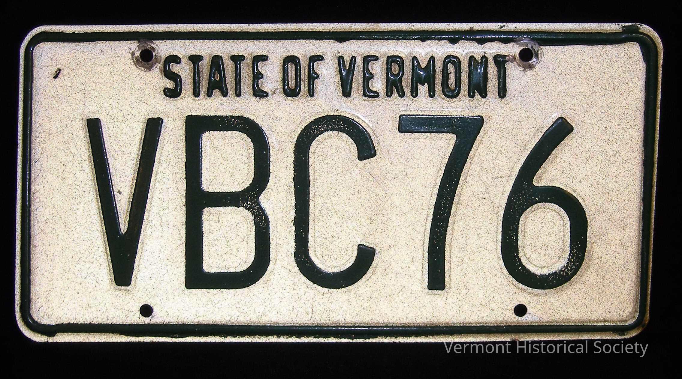 Rectangular metal license plate with the words "STATE OF VERMONT" across the top and the code "VBC76" in the center. There are four holes (two in the top and two at the bottom) for mounting the plate onto a car.
