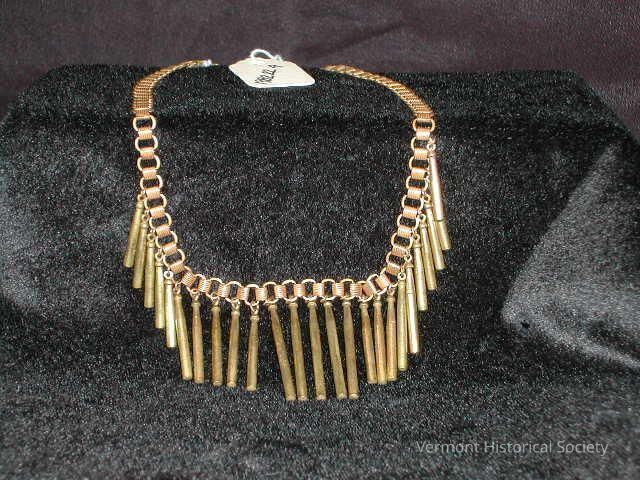 Brass necklace consisting of a chain and long brass pendant beads. The beads are each shaped similarly to a baseball bat.