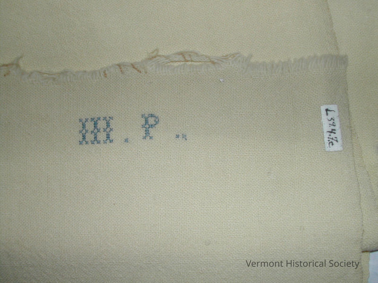 Handwoven wool blanket. It is plain woven in a cream color and consists of a single panel. It is marked in blue thread with the initials "M. P."Context