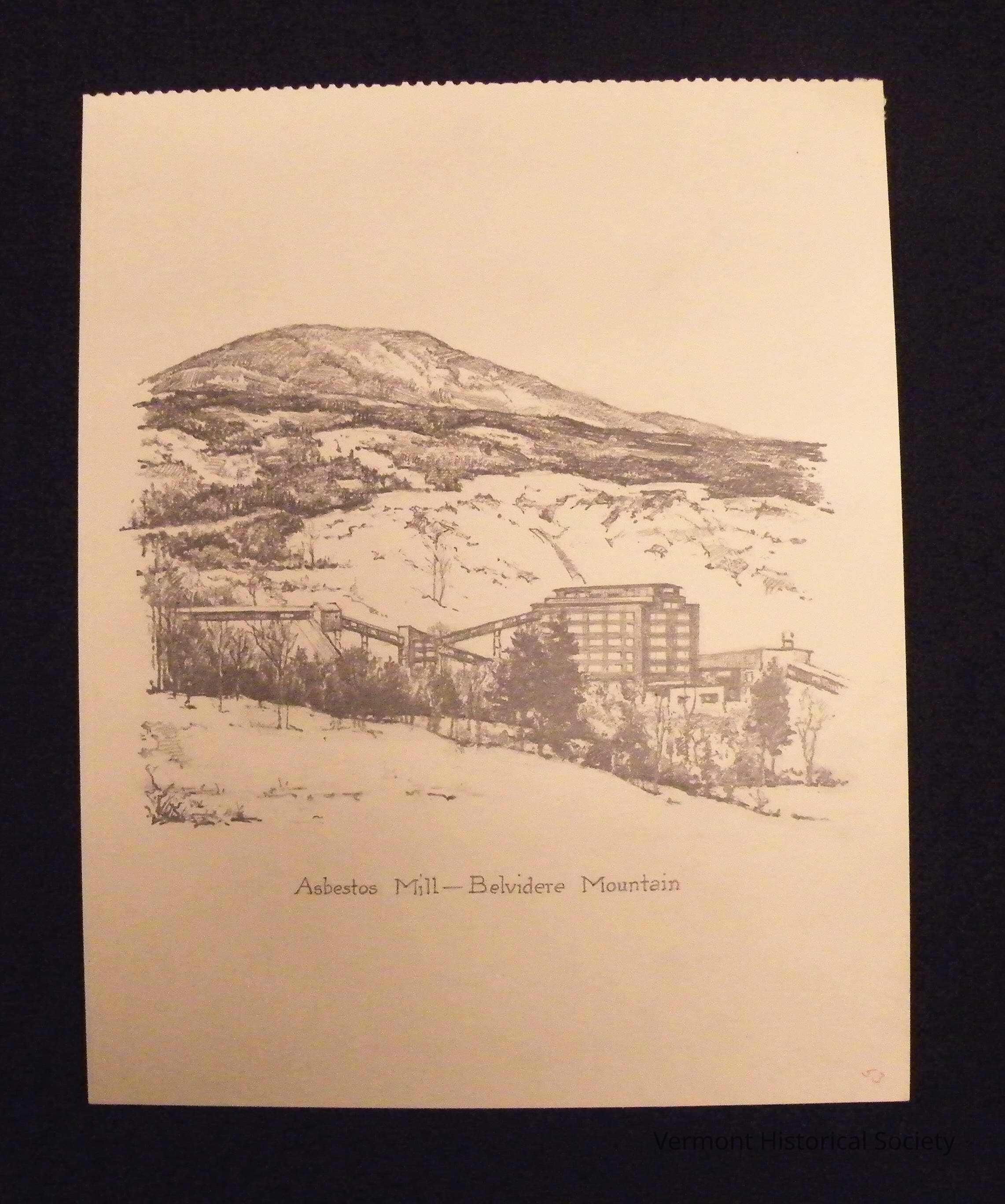 Pencil drawing showing a mountain-side factory. There are several raised passageways on stilts connecting from the large factory building to places outside the borders of the drawing. There are trees in the foreground and a large mountain in the background. The image is labeled, "Asbestos Mill - Belvidere Mountain" at the center bottom. The top edge of the paper is wavy from perforation.Type of Drawing