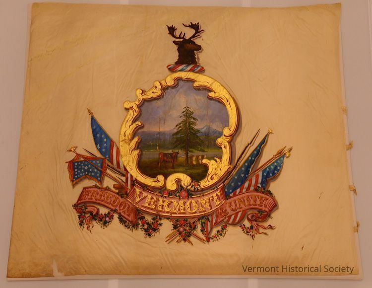 1st Vermont Infantry Regimental Flag. The flag has a white ground with a hand-painted Vermont state seal at the center. The base of the seal is decorated with 4 United States federal flags and a pink banner that reads "FREEMON / VERMONT / & UNITY".