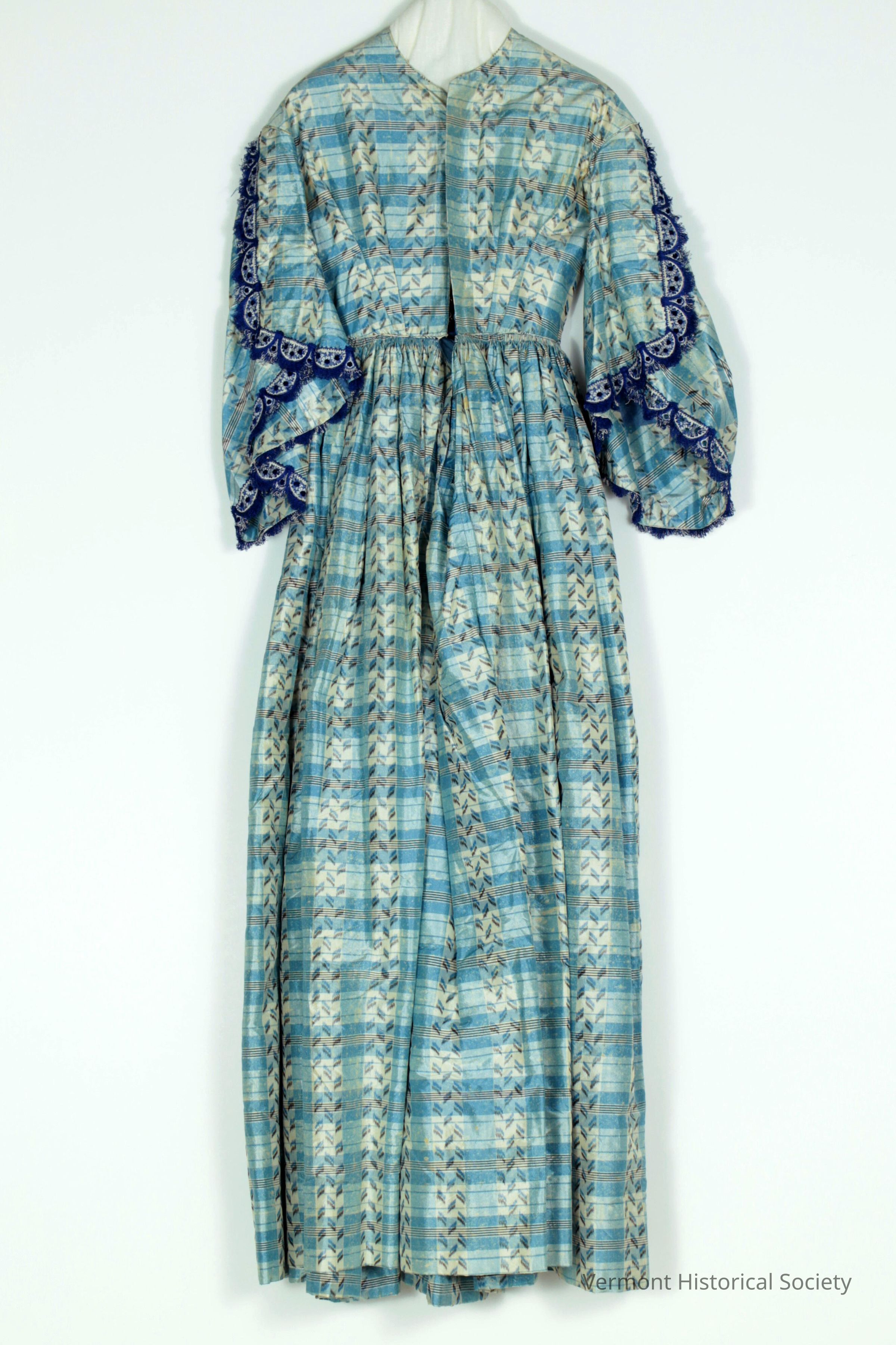 Plaid and ikat silk dress. The fabric is woven into a plaid design of varying shades of blue with subtle horizontal red stripes. The plaid is accented by vertical bands of ikat or chiné leaves. The bodice is shaped with four darts and the skirt is gathered into the bodice. The sleeves are cut into a surplice and trimmed with blue-and-white scalloped and fringed ribbon.