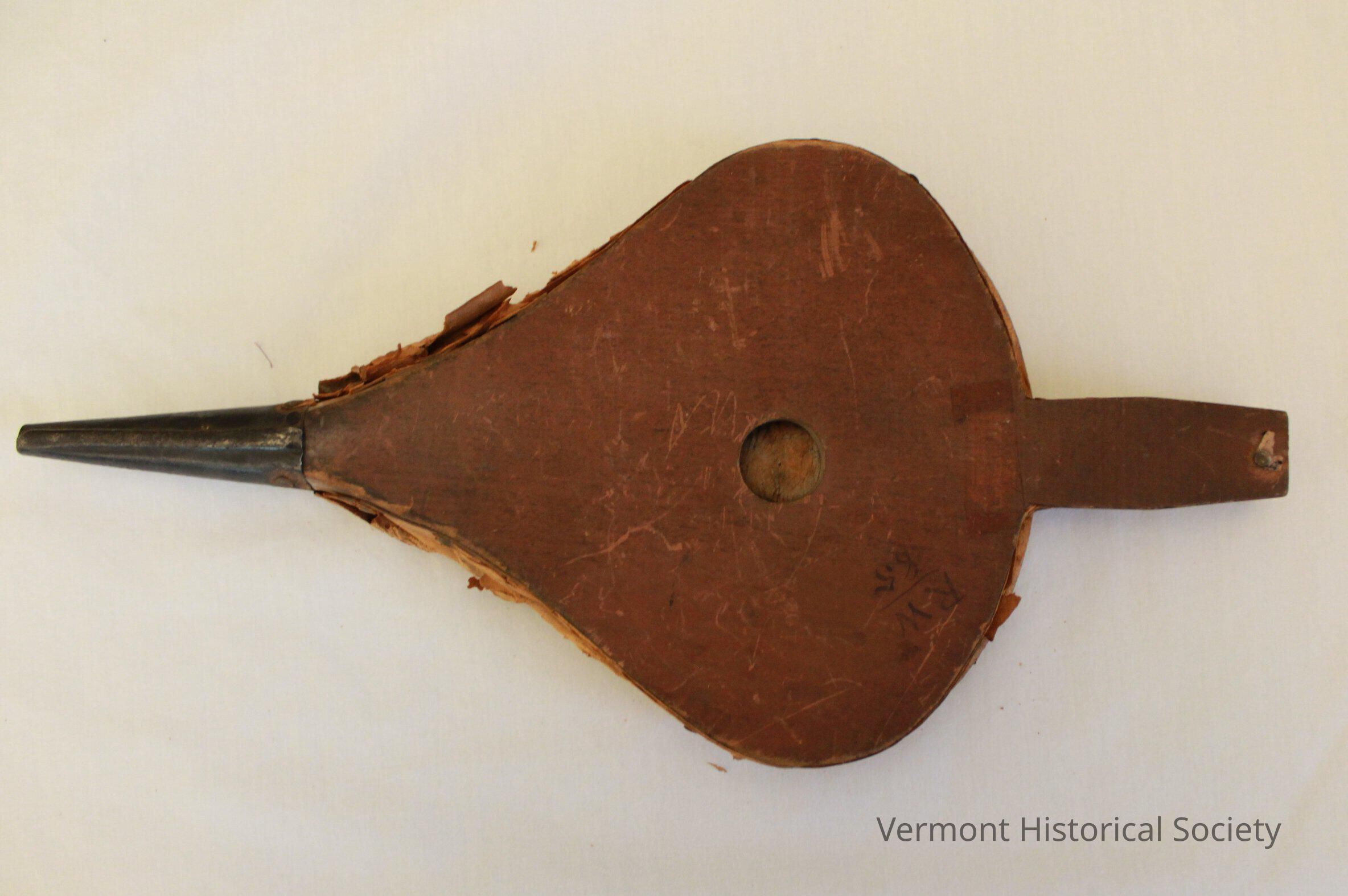 Small, household bellows consisting of wooden sides and leather connections. Attachment is made by using five tacks. The fixed leaf is made of soft wood that is 3/8" thick. In the broad part of the leaf is a 1" hole, which has a flap-type intake valve on the inside. The top leaf is similar to the fixed leaf, but about 1 1/2" shorter. The leather bellows material is stiffened by an internal hoop which keeps the leather extended on the bellows intake stroke. The top leaf is hinged to the bottom leaf by carrying the bellows leather at the junction up over the top of the leaf.Acquisition