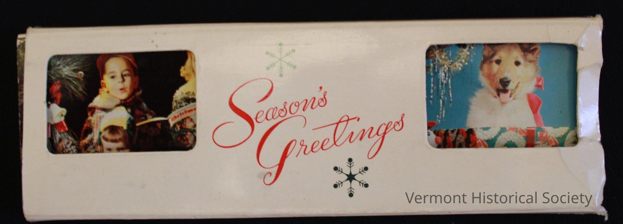 Set of two matchbooks with a cardboard holder. The holder is white and printed in red with the words "Season's Greetings". There are two window openings, showing the matchbooks inside. The matchbooks are printed on the front and back with full-color photographs. One matchbook is printed on the front with a photograph of four white children in plaid winter clothes singing, and printed on the back with an image of a snowy village square. The other matchbook is printed on the front with an image of a dog in a wrapped gift box next to a Christmas tree, and printed on the back with the words, "SEASON'S GREETING AND A HAPPY NEW YEAR". The interior of each matchbook is printed with the words, "BARRE TRUST COMPANY / The Bank With The Time and Temperature Sign".Context