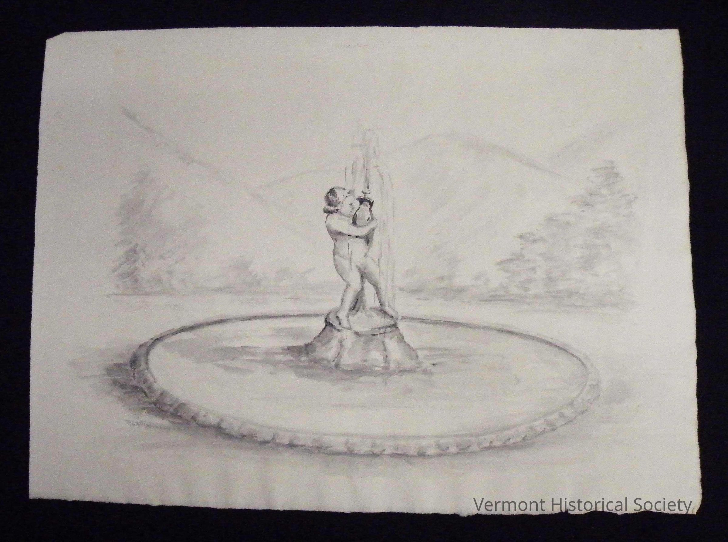Drawing of an outdoor fountain consisting of a statue of a nude child holding a vase. Water is sprouting from the vase into a circular pool below. There are mountains in the backgroun.Type of Drawing