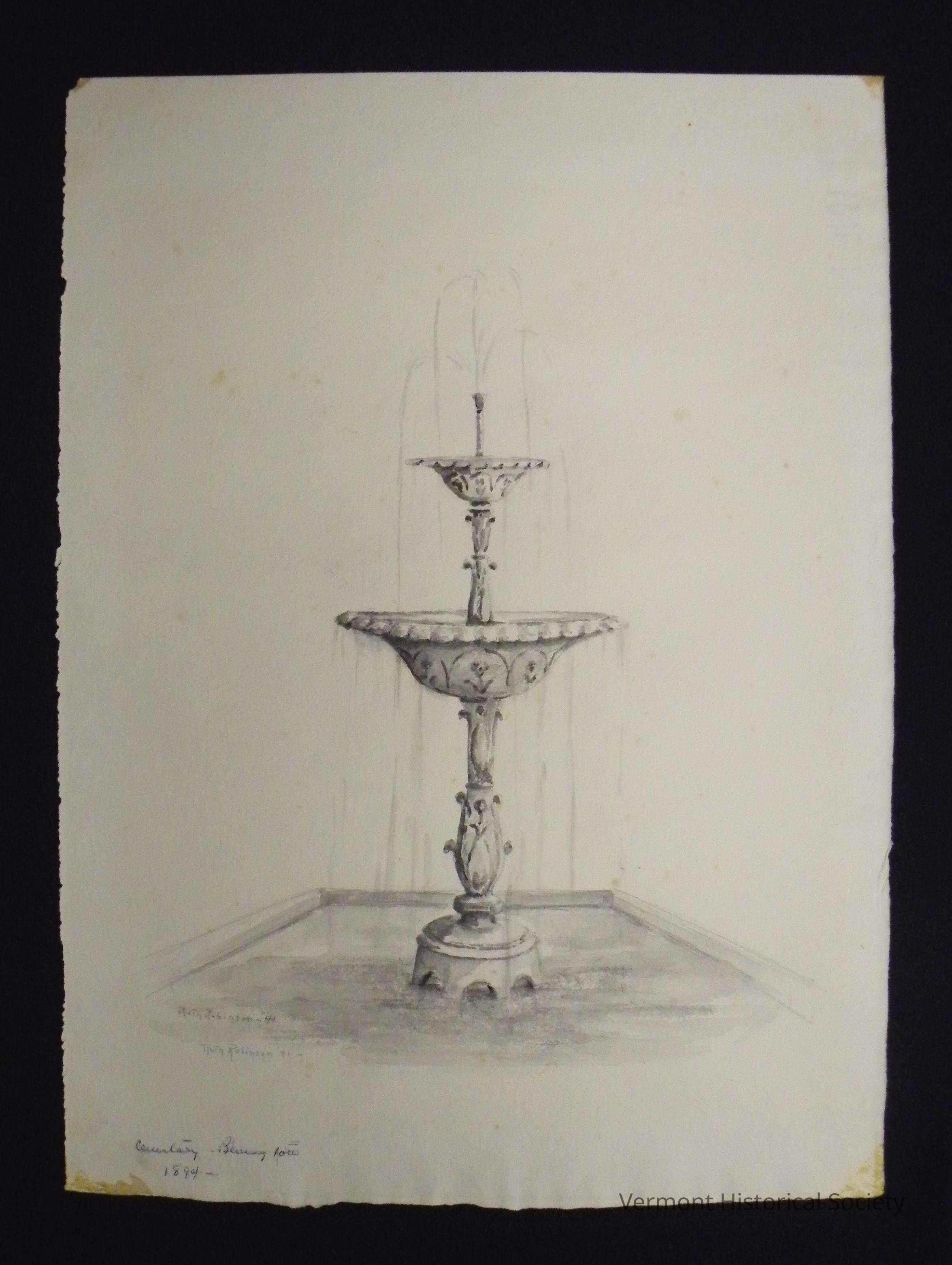 Drawing showing a fountain that consists of 2 elevated basins on a central stem within a rectangular pool. There is a waterspout at the center top, and water flows from the top basin down into the pool.Type of Drawing