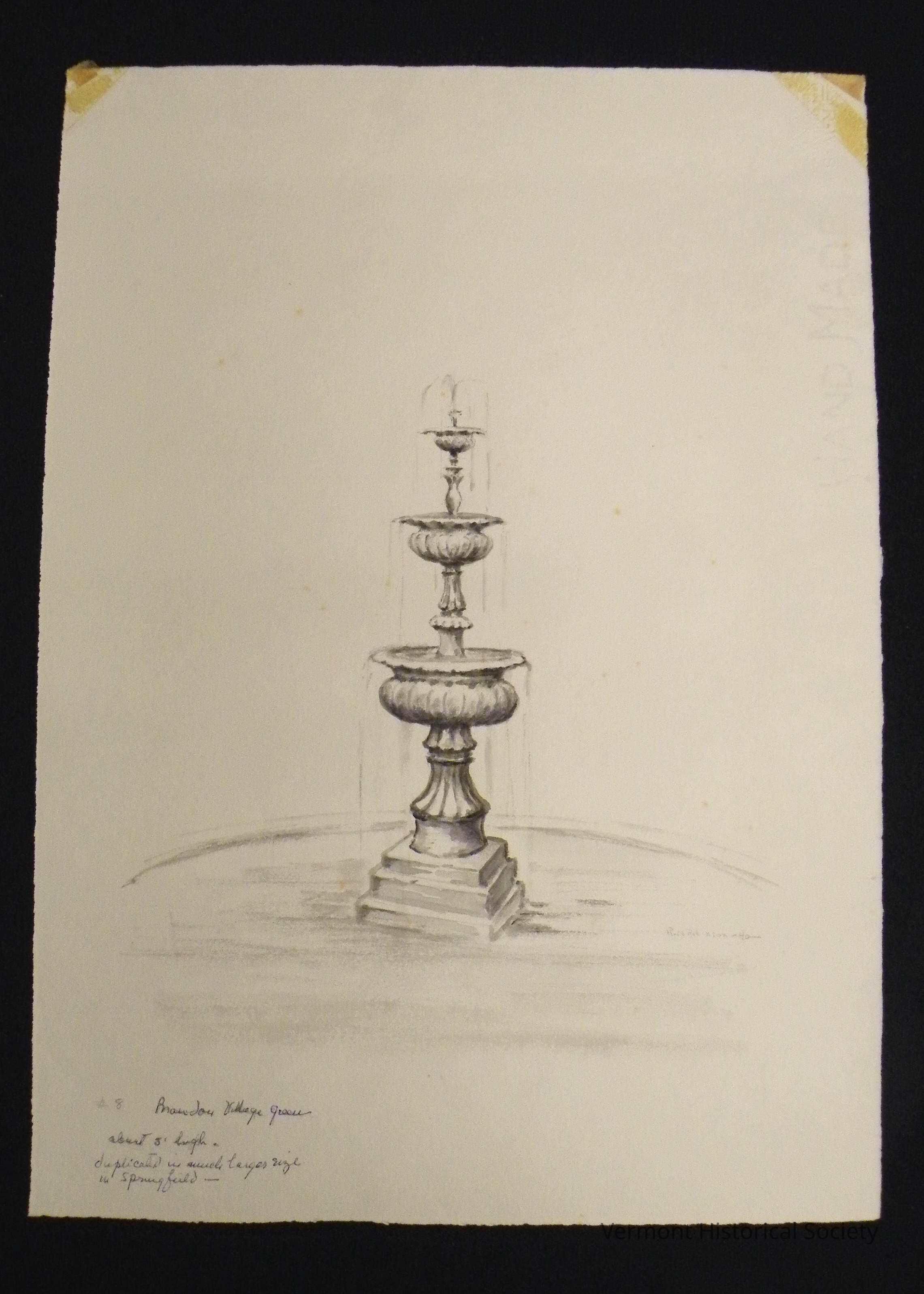 Drawing showing a fountain that consists of 3 elevated basins on a central stem within a rectangular pool. There is a waterspout at the center top, and water flows from the top basin down into the pool.Acquisition