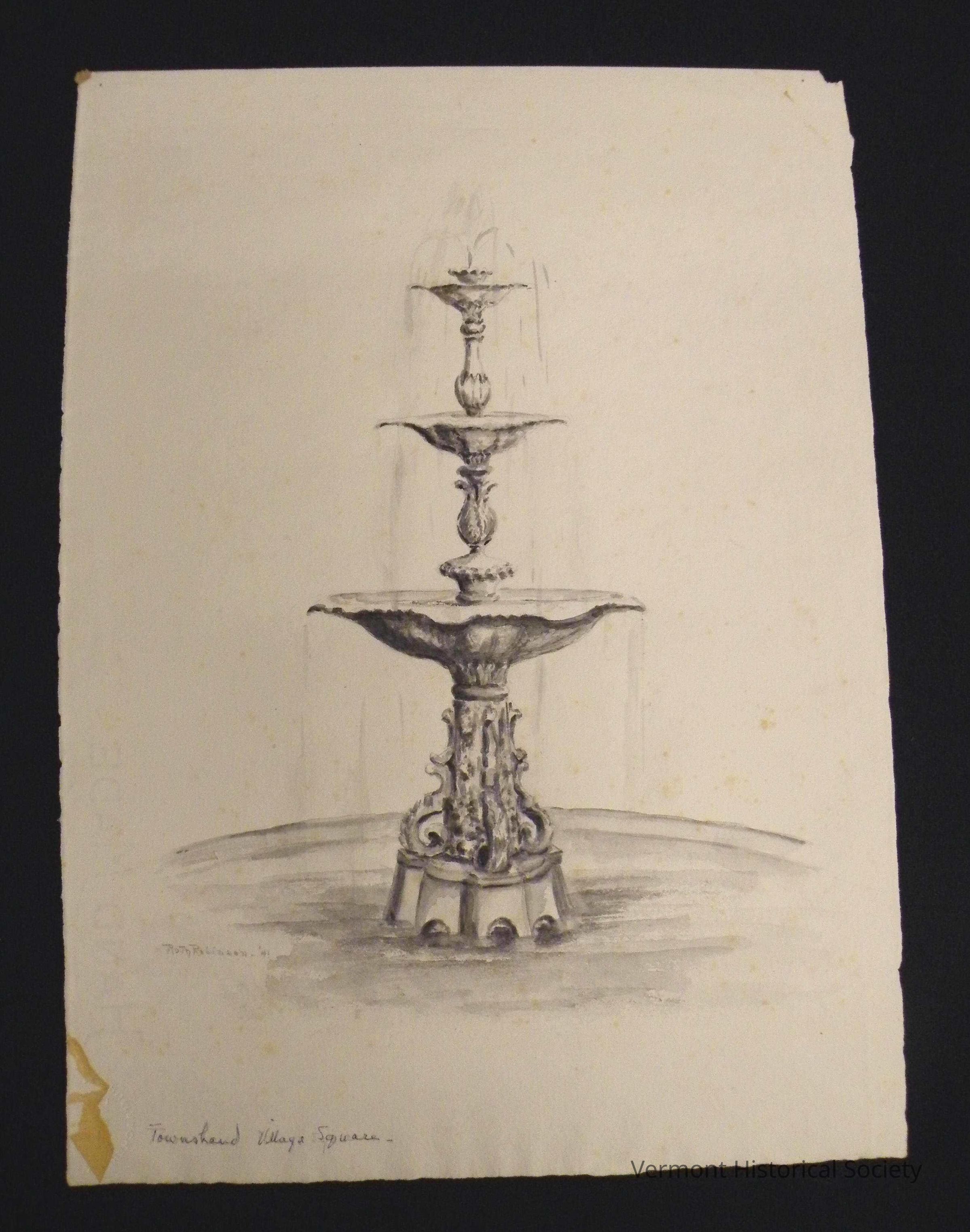 Drawing showing a fountain that consists of 3 elevated basins on a central stem within a rectangular pool. There is a waterspout at the center top, and water flows from the top basin down into the pool. The base is elaborately carved.Acquisition