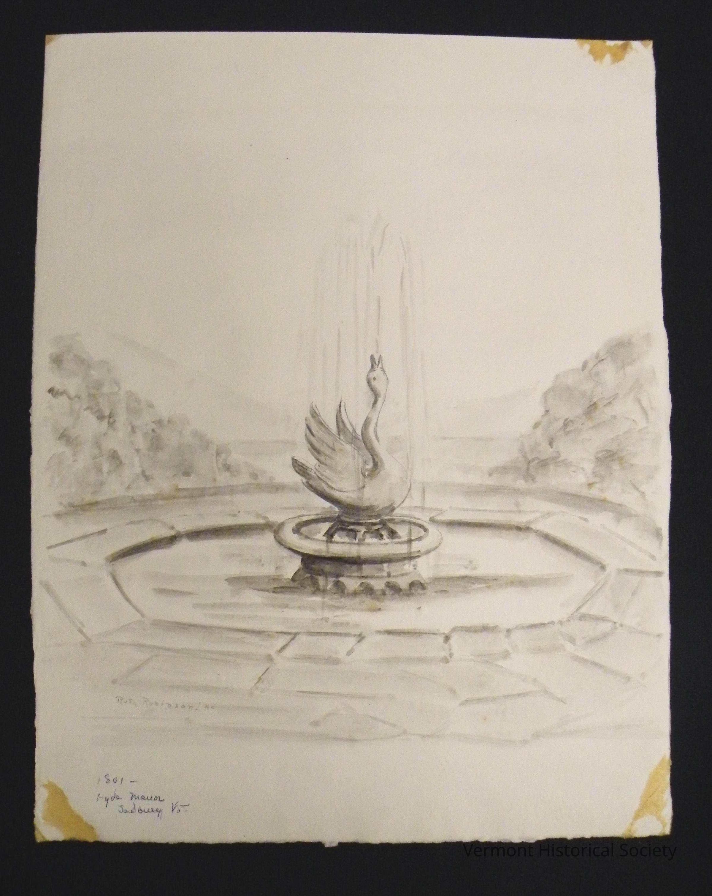 Pencil and watercolor drawing of a fountain in the shape of a swan. The swan has its head pointed upwards and wings outstretched. The water of the fountain streams out of the swan's mouth. The pool of the fountain is round and surrounded by large stone blocks or pavers. A lake, bushes, and mountains are in the background. The picture is signed at the lower left corner in pencil, "Ruth Robins '42". Beneath the signature in the blank part of the paper is the inked inscription, "1801 - Hyde Manor Sudbury V.T."Artwork Details