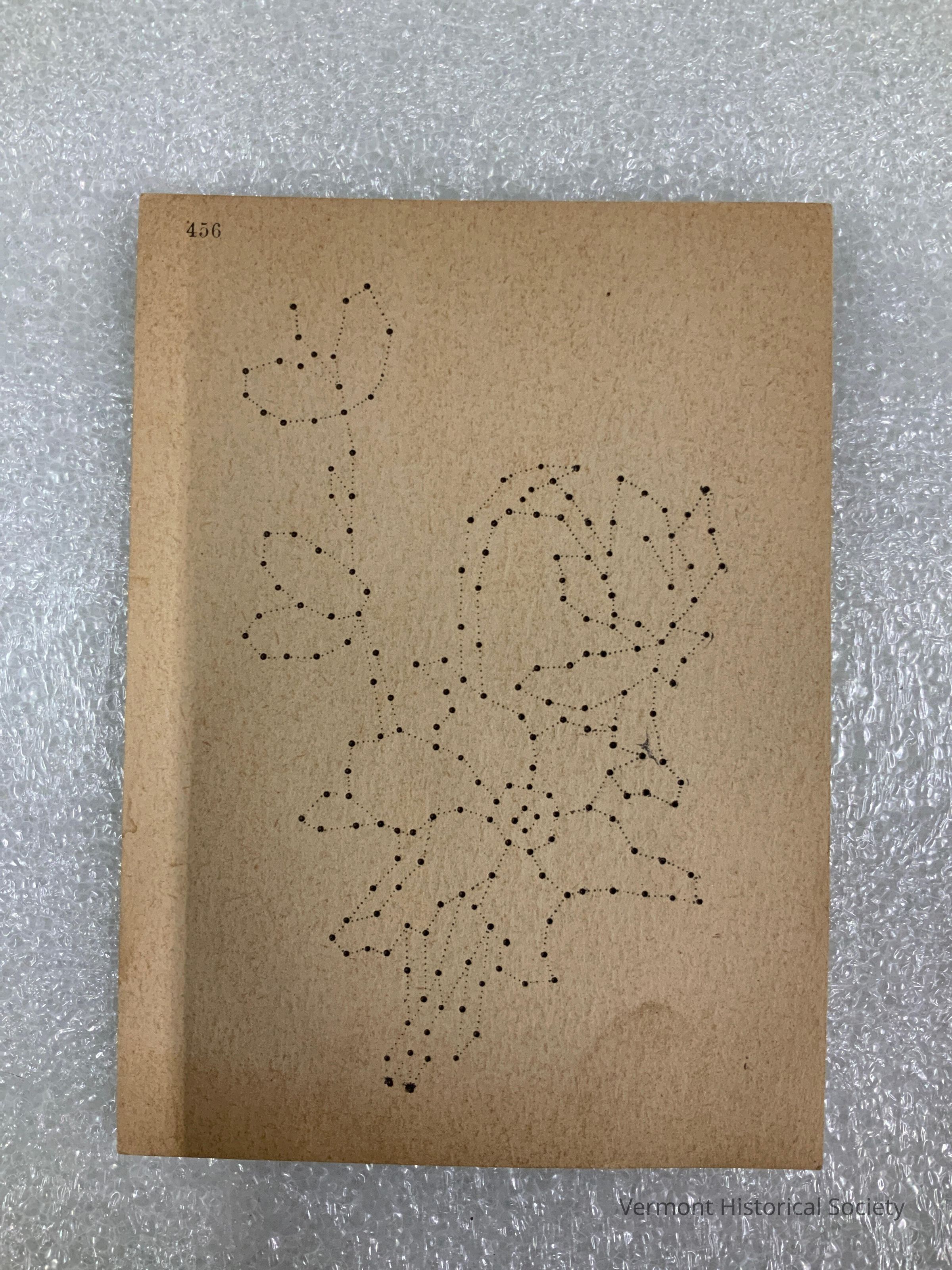 Rectangular cardboard sewing card printed on one side with a dotted line drawing of three stems of daffodils. There are small holes printed along each line.Context