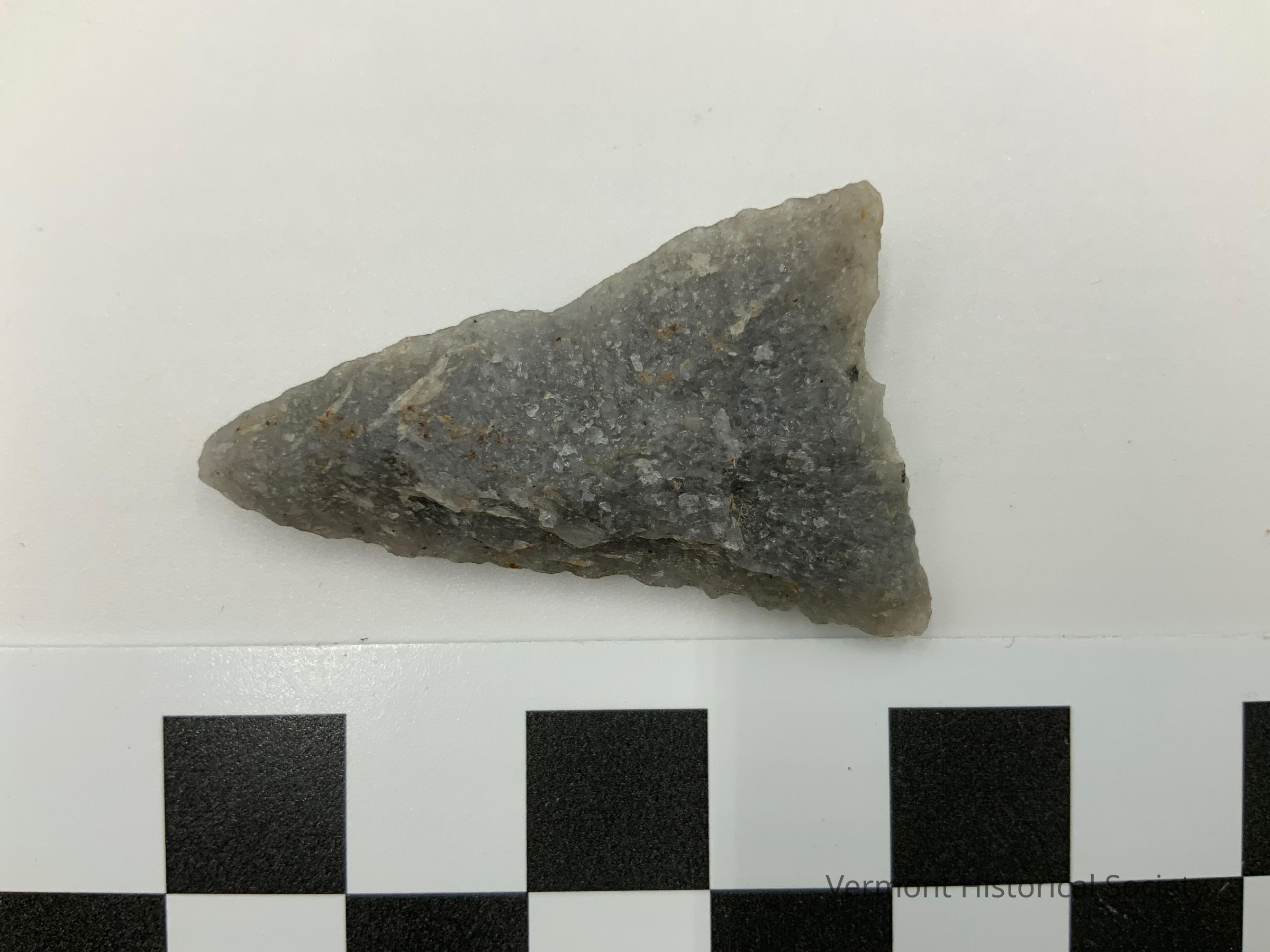 Triangular grey chipped stone projectile.