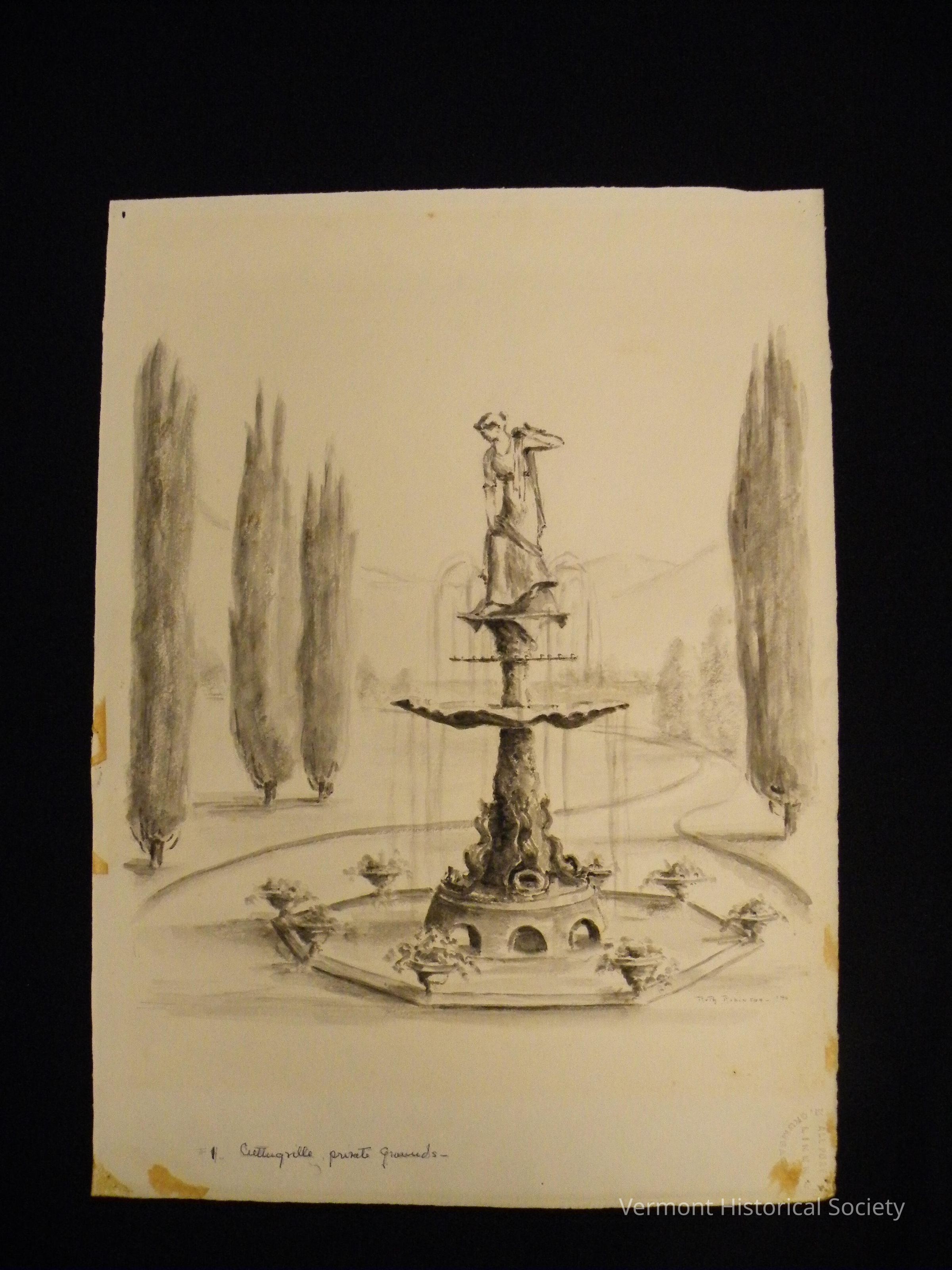 Drawing showing a fountain consisting of a statue of a woman in classical dress standing on a raised basin on a central support. It is sitting in a 9-sided pool. The fountain is in a park setting surrounded by tall cypress trees, and there are mountains in the background.Acquisition