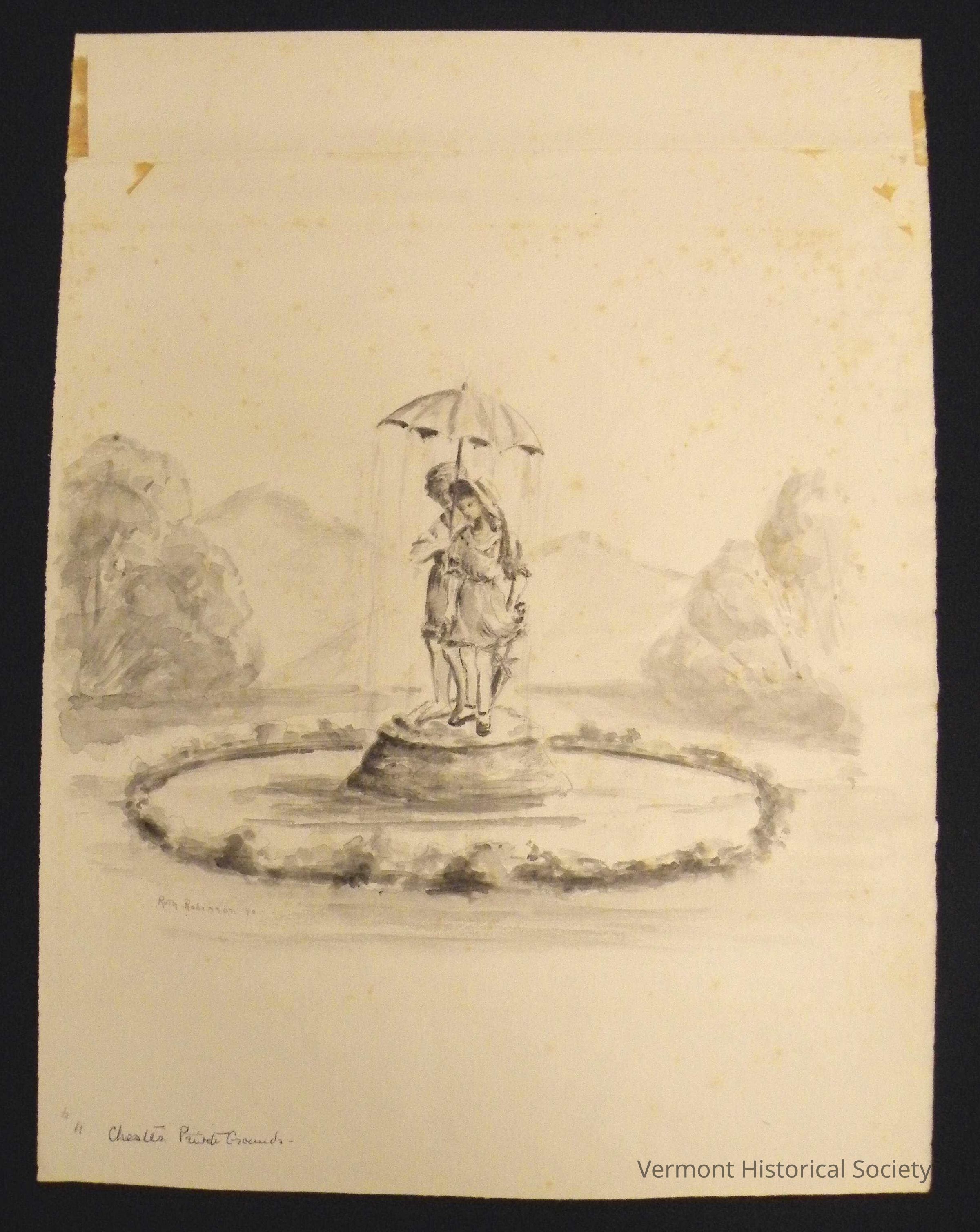 Drawing showing a fountain consisting of a statue of a boy and girl under an umbrella. The statue is placed at the center of a round pool, and water streams from the top of the umbrella. There are large shrubs and mountains in the background.Acquisition