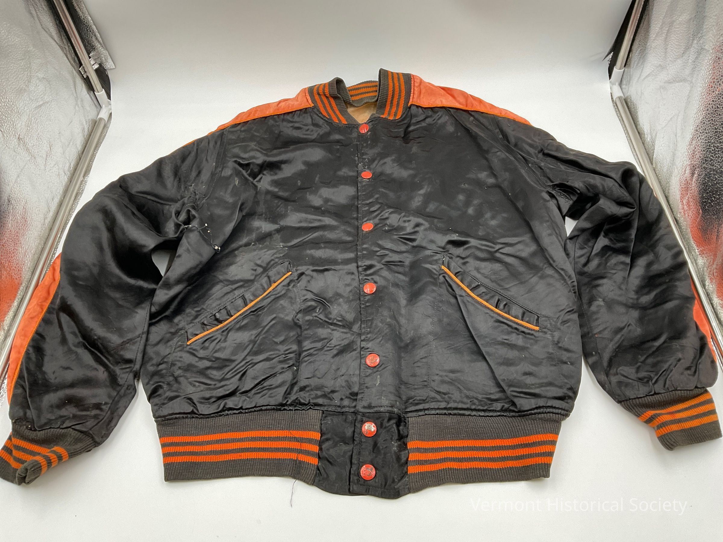 Black polyester satin jacket with orange stripes down the sleeves. The sleeves have knitted cuffs. The jacket closes with orange metal snaps up the center front. The words, "Brooksie's Diner," are appliqued to the reverse in orange felt. There are 2 pockets on the front.Context