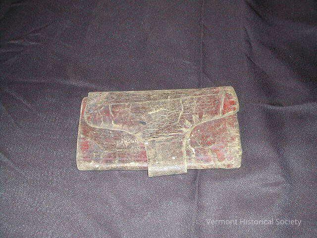 Red Moroccan leather wallet folded into thirds with a long central strap. The outer flaps are lined with green leather and the center flap is lined with red leather, still bright. The interior is stamped, "BENJAMIN SARGEANT, PUTNEY, V.T." in gold letters.