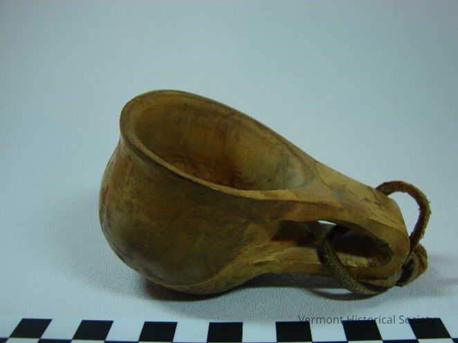 This maple burl canoe cup was carved 1n 1956 or 1957 by Ned Hakey who lived on River Lane in Swanton. It represented the loon if turned upside down. The bowl was hollowed out by drilling then carving with a crooked knife.