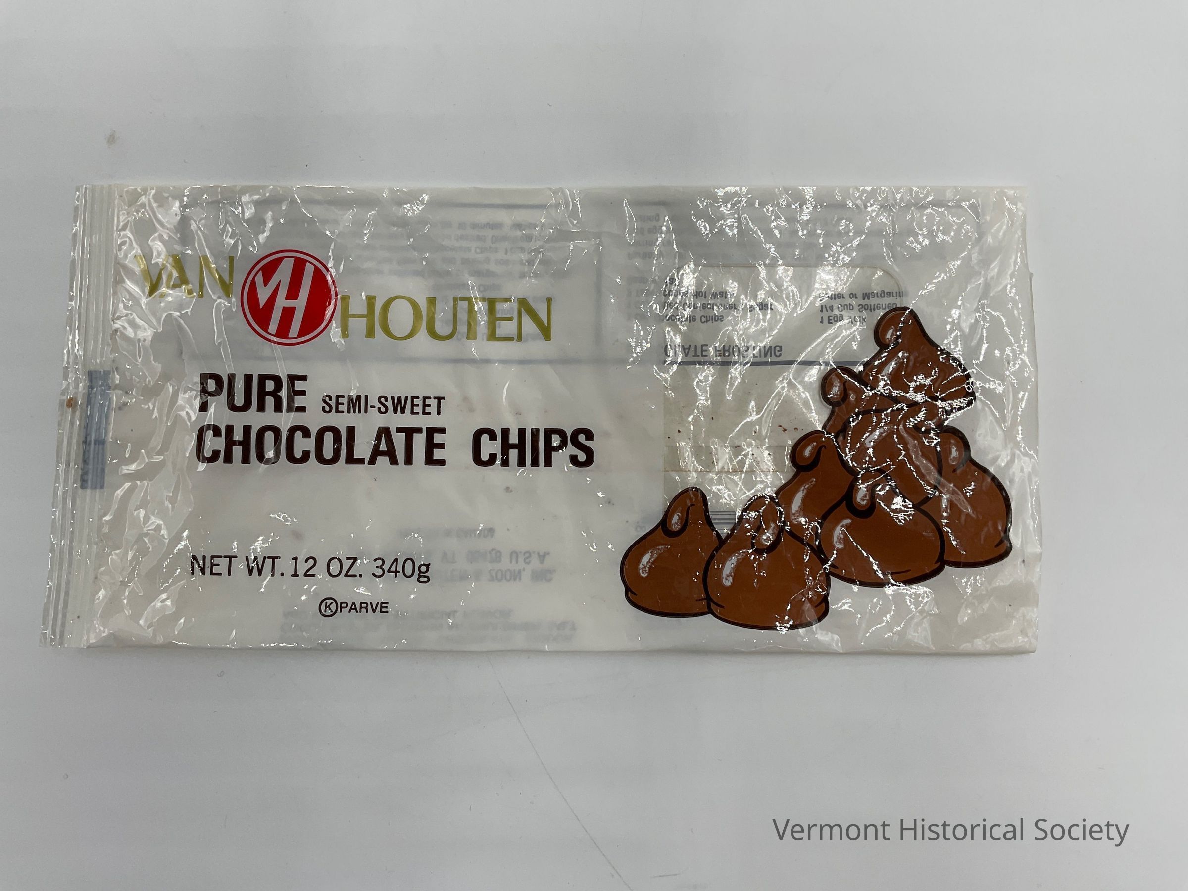 White, 12-ounce bag for chocolate chips. The bag reads "VAN HOUTEN" in gold letters around a round red logo with VH in the negative space. Under the logo in black text it reads "PURE SEMI-SWEET / CHOCOLATE CHIPS / NET WT. 12 OZ. 340g", and underneath this is the letter "K" in a circle followed by the word "PARVE" to indicate that the product is kosher. There is a cartoon image of 8 chocolate chips on the right side of the bag.Context
