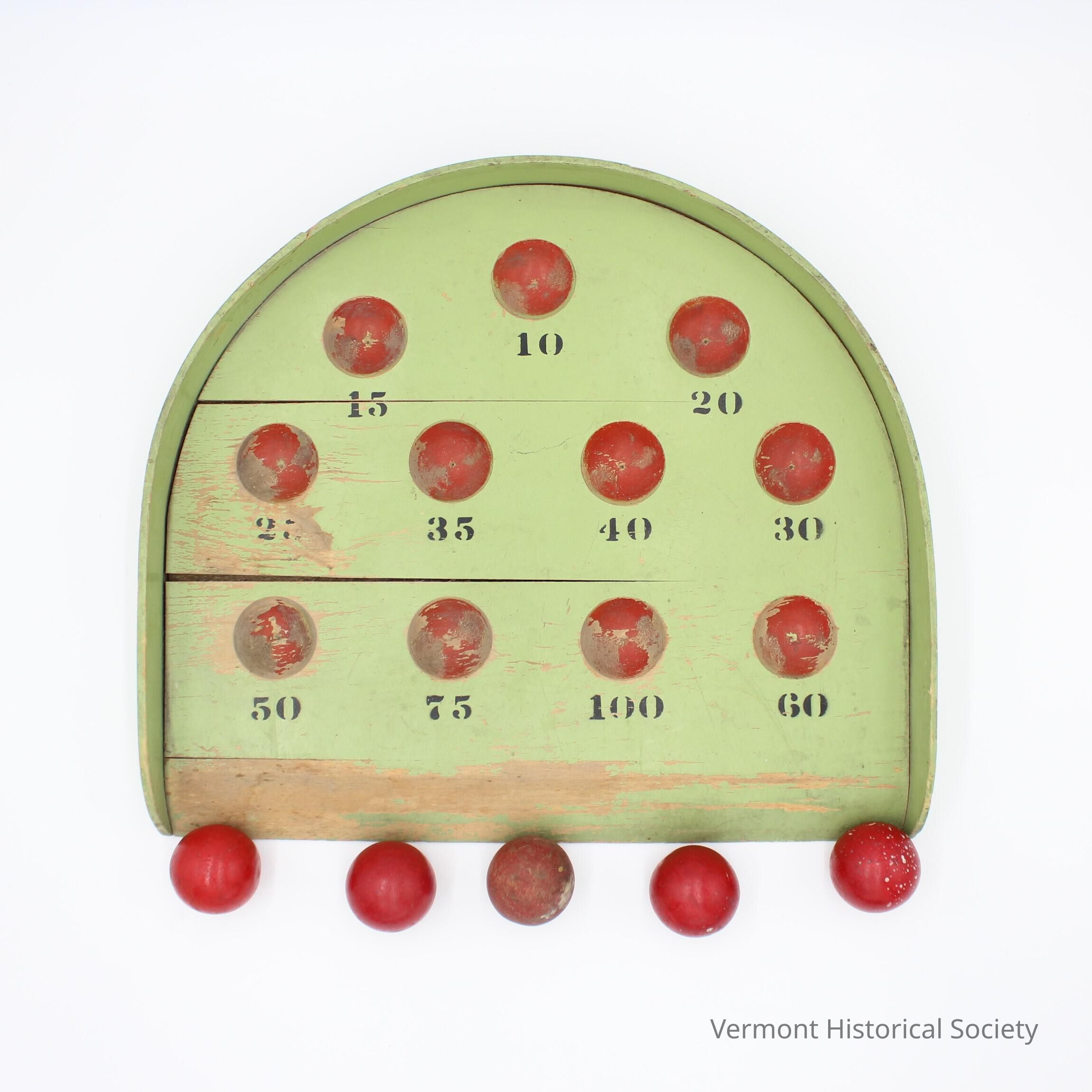 Horseshoe-shaped wooden game board made from four wood boards with eleven rounded divots carved into the face. The straight edge of the board is sloped downward, creating a ramp. The curved side is edged with a thin piece of wood, bent to follow the curve of the board. The board is painted green and the divots are painted red. Each hole is labeled with a black, stenciled number (10, 15, 20, 25, 35, 40, 30, 50, 75, 100, 60). There are five red-painted round wooden balls.Context