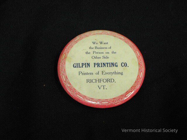 Round advertising hand mirror with metal back, similar in appearance to a pin button. The back reads, "We Want the Business of the Person on the Other Side / GILPIN PRINTING CO. / Printers of Everything RICHFORD, VT."Context
