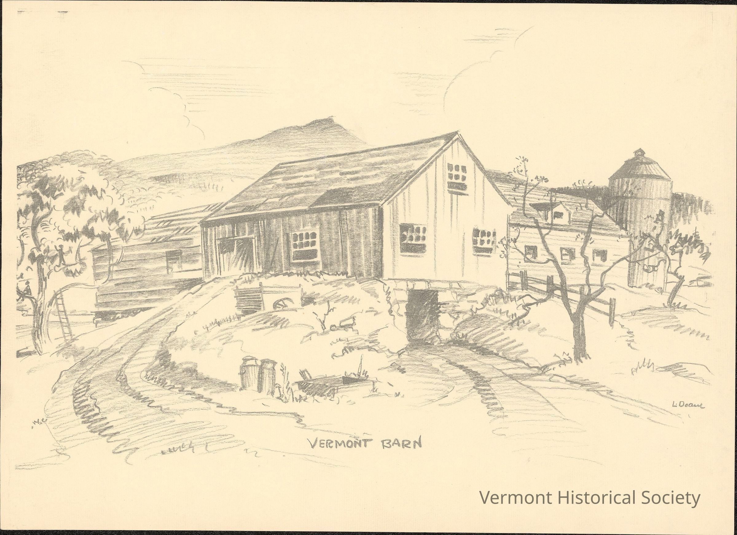 Pencil drawing showing a barn on a hill. The barn consists of three conjoined buildings and a silo. On the right, the hill cuts aways to show an entrance into the barn's stone foundation. A path leads to the doorway. Another path leads up the hill to the left to a doorway on the barn's main floor. A mountain, possible Camel's Hump, is visible in the background. At the left edge of the drawing, a ladder is leaning against a tree, and there is a person sitting on the tree branch.Type of Drawing