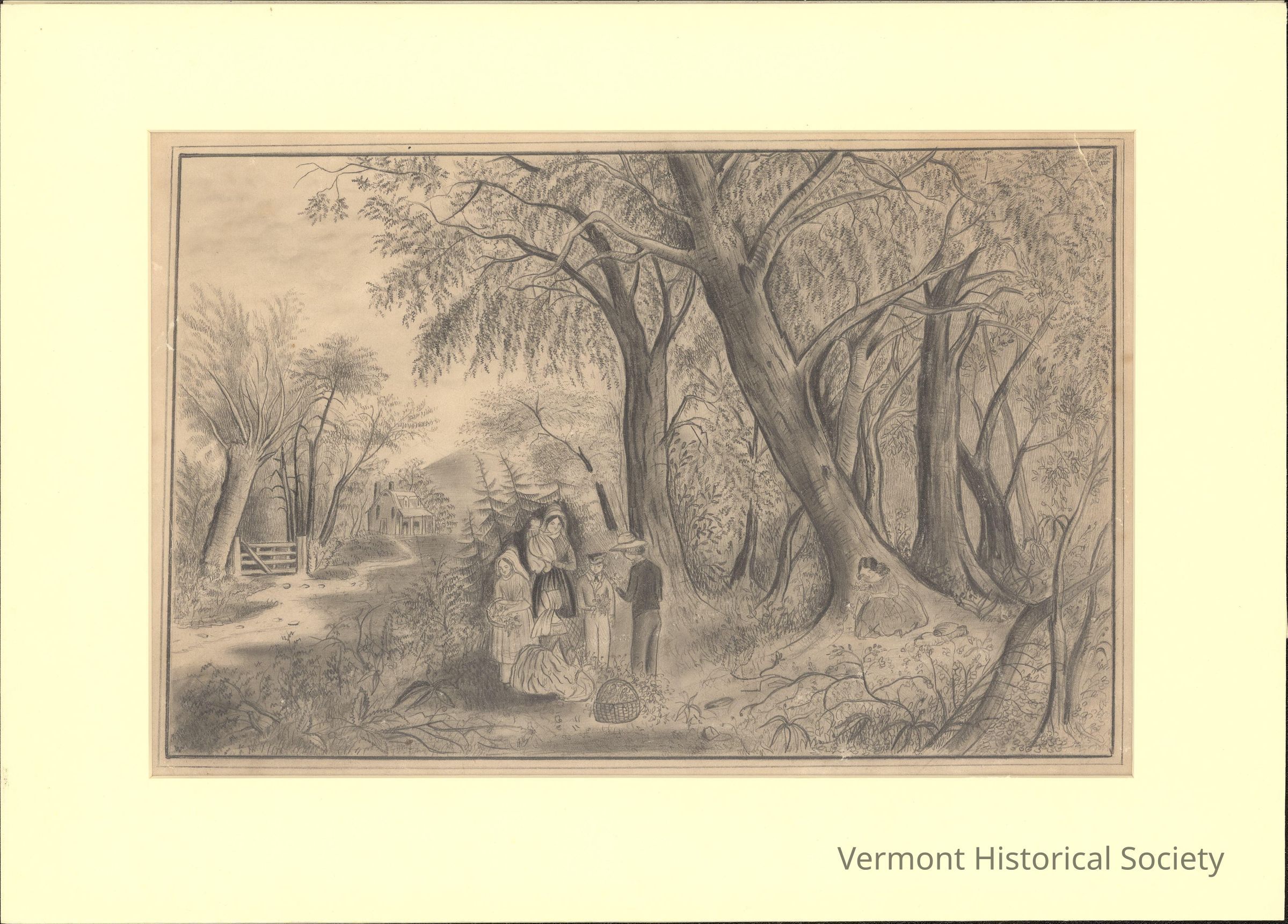Pencil drawing showing a group of 7 people within a forest landscape. The group consists of 2 boys, 2 girls, 2 women, and a baby. The group is to the right of a path beside tall trees. There is a house at the end of a path.Type of Drawing