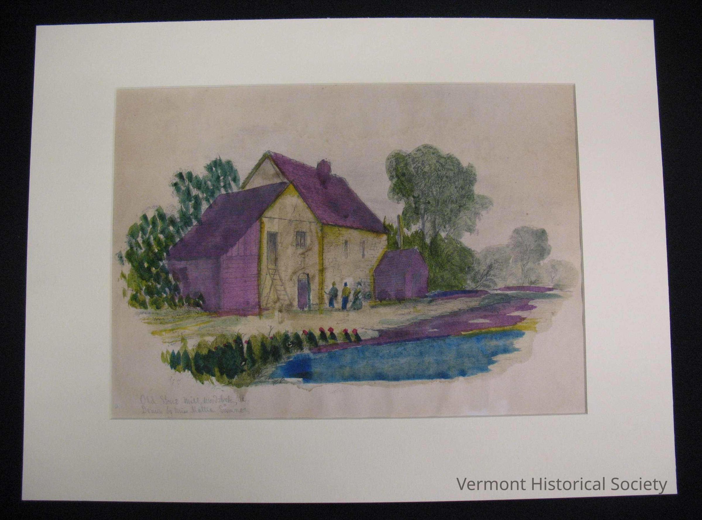 Watercolor painting showing a tall structure near a body of water. The structure consists of 4 parts: 2 conjoined stone buildings, and two wooden attachments. The roof and the wooden attachments are painted purple. There are 3 people standing near the building. The lower left corner is labeled in pencil: "Old Stone Mill, Woodstock, Vt. / Drawn by Miss Mattie Sumner".Type of Painting