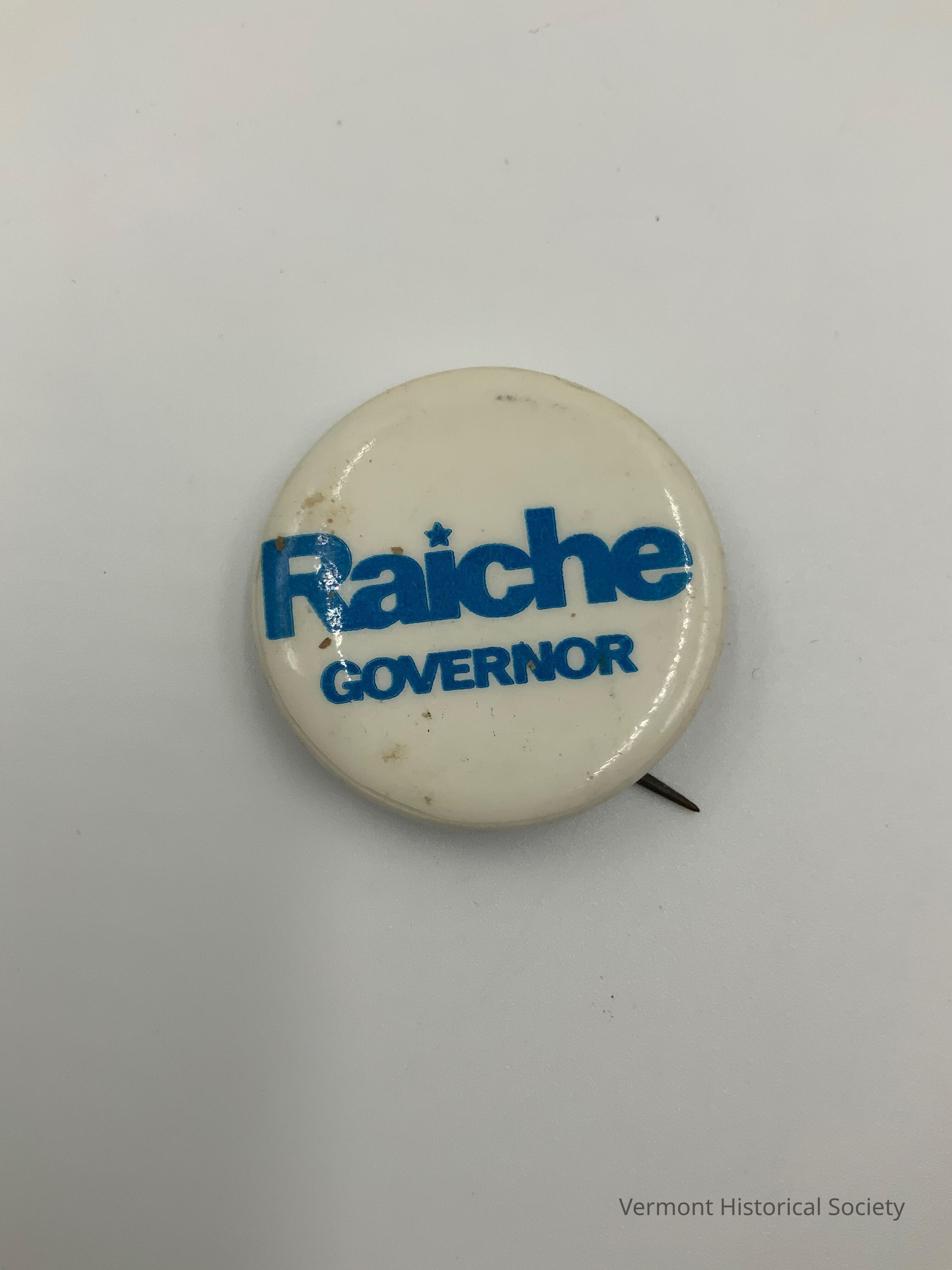 Round white button with the blue inscription, "Raiche GOVERNOR".