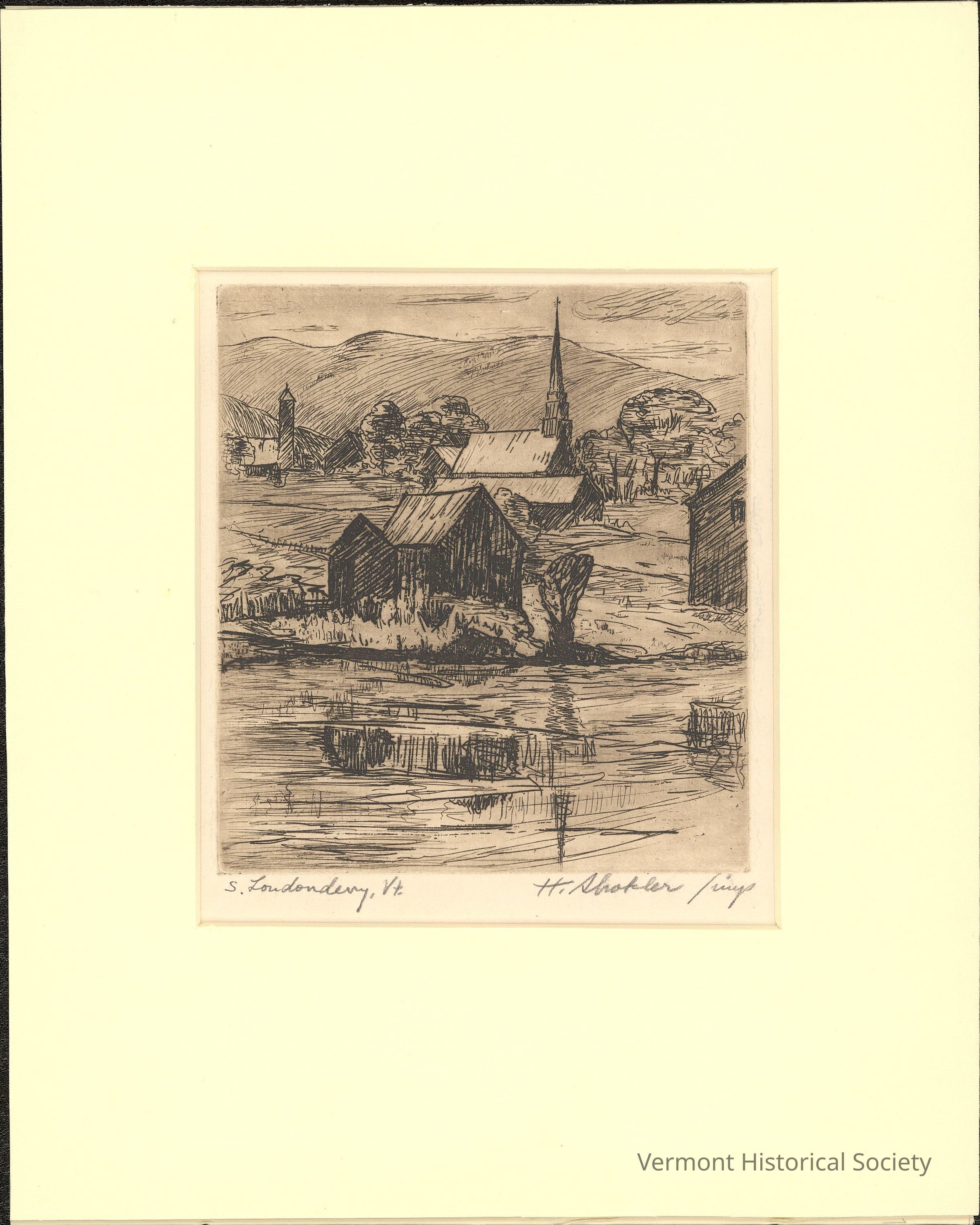 Landscape print showing a roughly sketch barn or other farm building with a church in the background. The barn is near a body of water. There is a mountain range in the background.