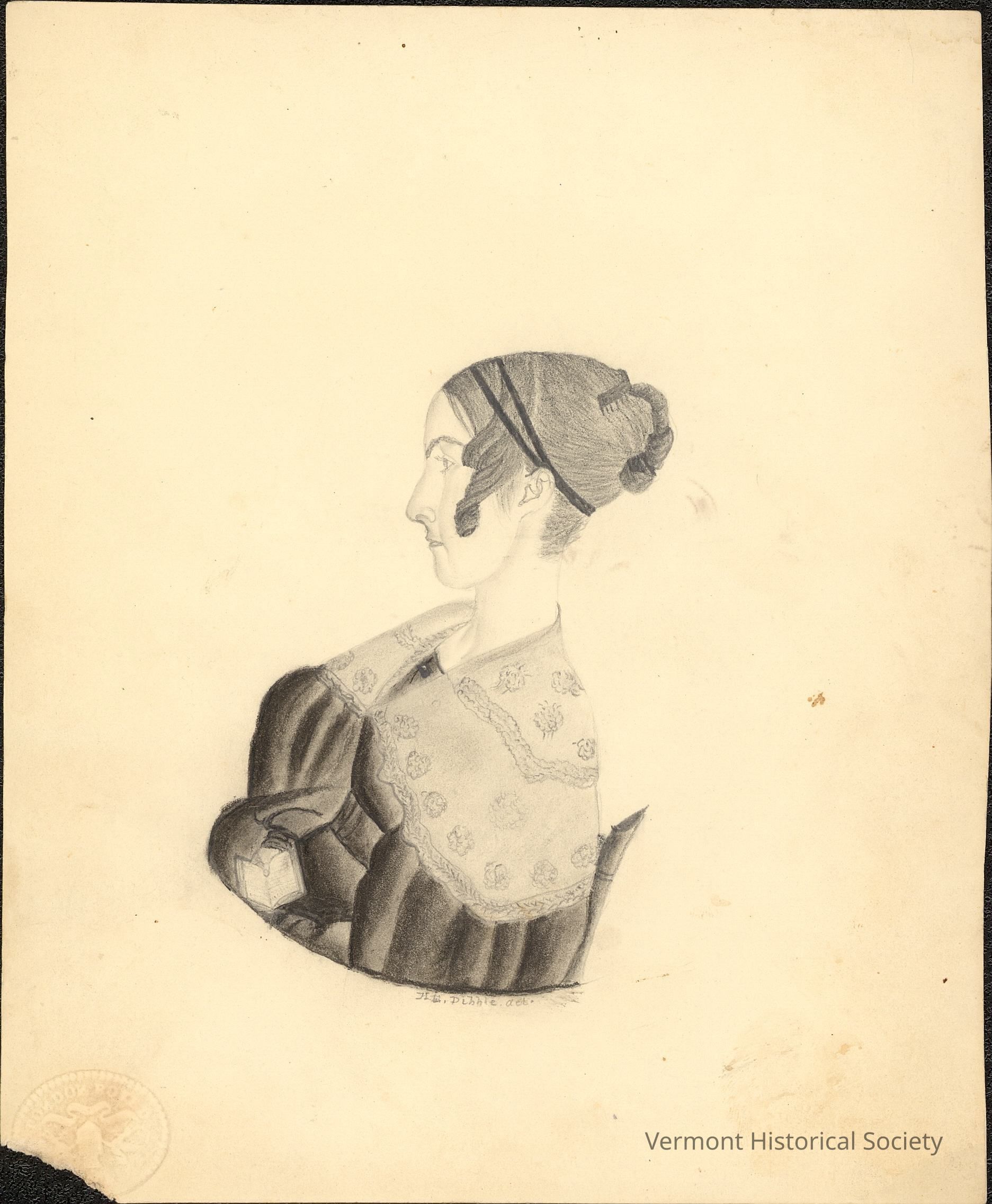 Pencil drawing showing a seated woman in profile. The woman is visible from the waist up, with the bottom edge cut off in a curve. The is wearing her hair secured at the back of her head with a decorative comb and two bands that circle from the nape of her neck to her hairline. There is a curled ringlet hanging in front of her ear. Her black dress has voluminous sleeves and a wide, white collar with small rosettes. Her disproportionately small hand is holding a tiny book.Type of Drawing