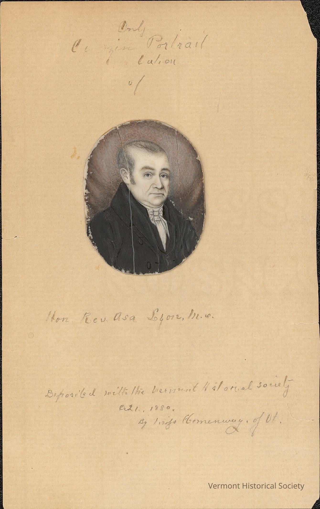 Watercolor portrait miniature on ivory. The portrait shows a middle-aged white man with short hair. His hairline is receding at the corners. He is wearing a black jacket and vest, and white shirt with a cravat tied into a bow. The background is painted brown and shaded to look like curtains. The ivory piece is oval, and there are two vertical cracks. The whole is mounted onto paper that has the inked inscription, "Only C[illeg]zin Portrait taken of / Hon. Rev. Asa Lyon, M. C. / Deposited with the Vermont Historical Society Oc 21, 1880. By Miss Hemenway of Vt."Type of Painting