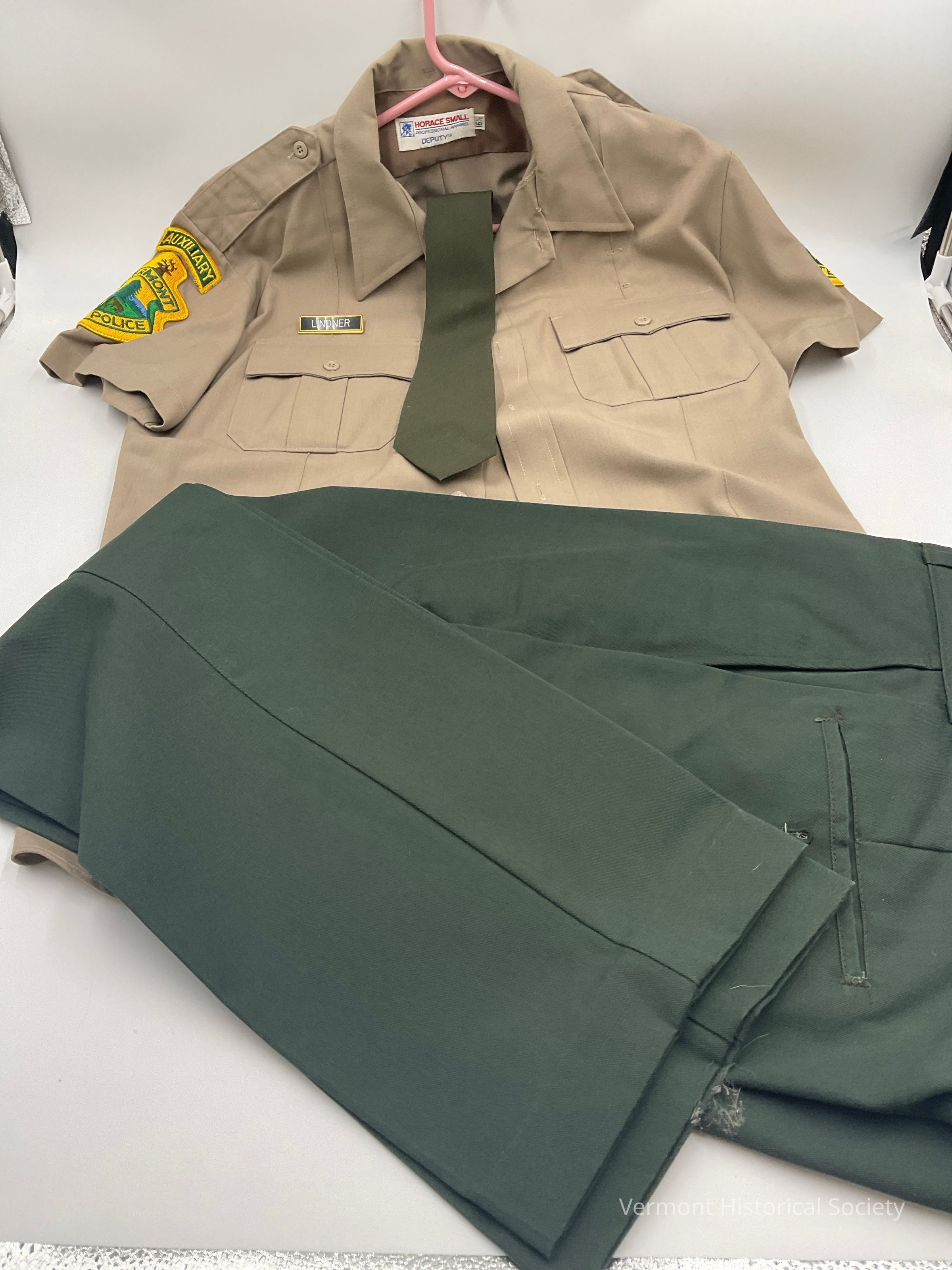A = Khaki shirt with yellow patches on each shoulder that says "Vermont State Police" with a small patch above that says, "Auxiliary."