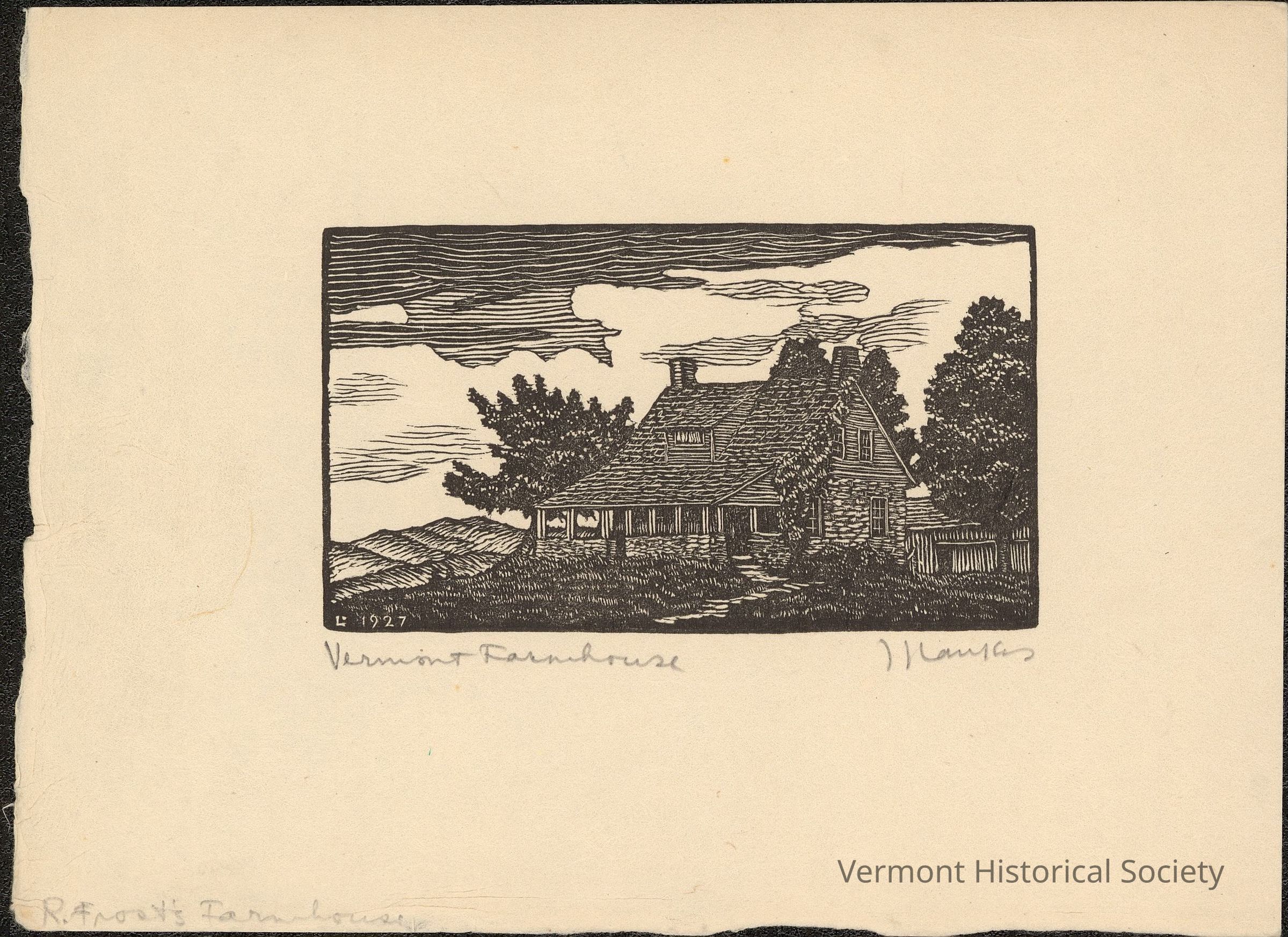 Woodcut print showing a stone and wood-sided house at the center. The house has two chimneys, a porch spanning the entire front, and a central dormer window. There is a mountain range in the background. The bottom left corner is signed, "L. 1927". The title, "Vermont Farmhouse" and signature, "J J Lankes", are penciled beneath the print.Artwork Details