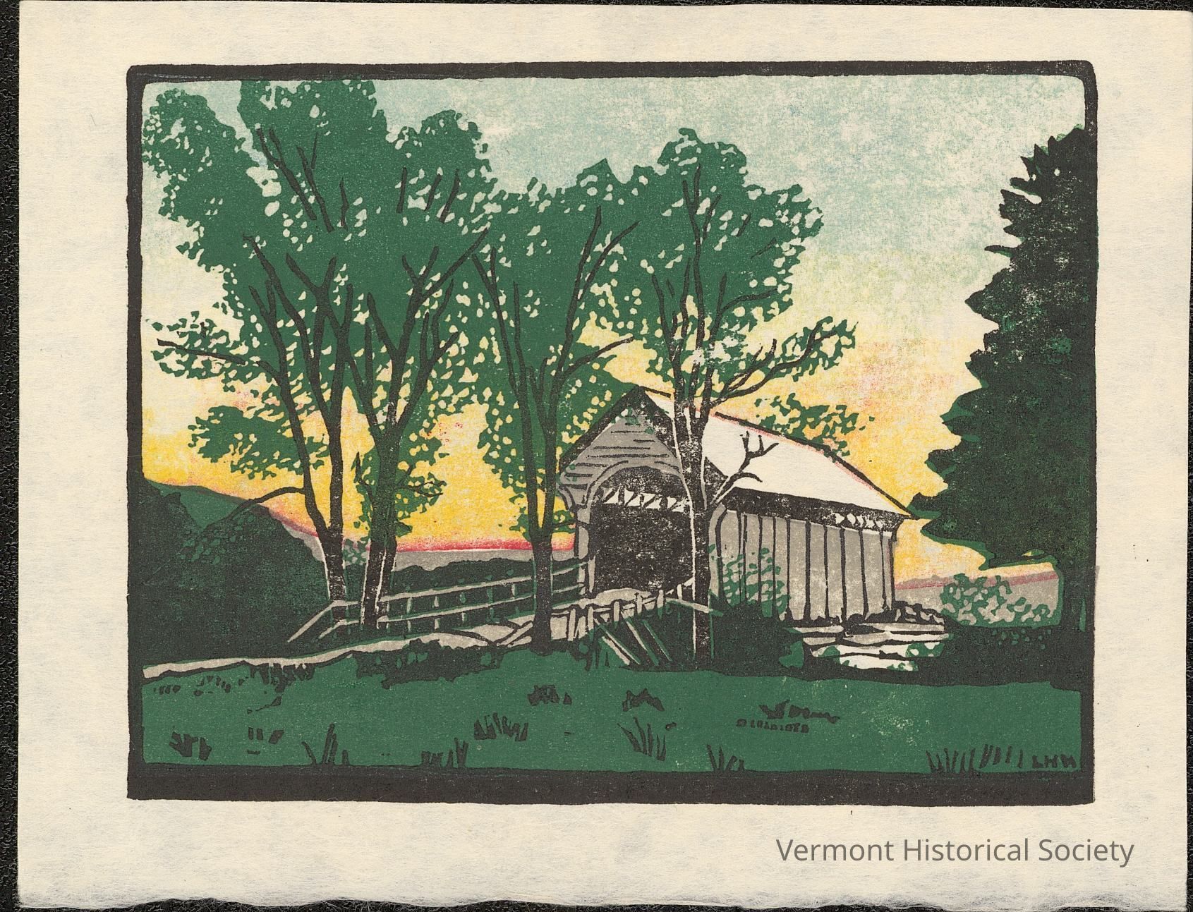 Full-color print showing a covered bridge. The bridge is crossing a river or stream that is hidden beneath the grassy foreground. There are four trees flanking the road and short, uncovered bridge leading to the structure. The sky is colored to indicate a sunset. The road and bridge are outlined with black, and details o the grass of the tree trunks are black.