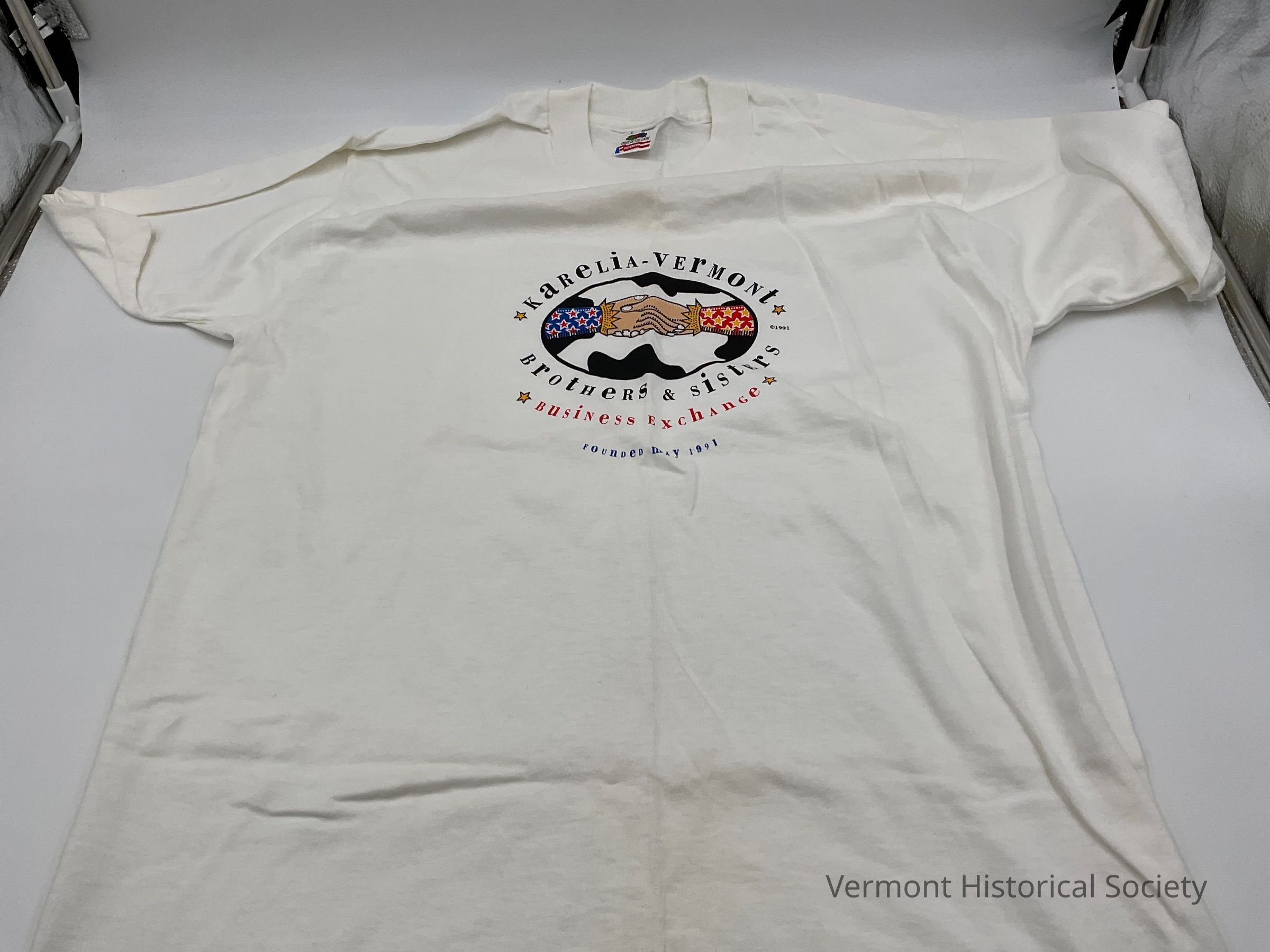 Whit t-shirt printed at the center front chest with a logo consisting of two clasped hands within an oval. The oval has cow spots. It is surrounded by the words, "KaReLiA-vErMoNt / BrOtHeRs & SiStErS / BuSiNeSs ExChAnGe / FoUnDeD mAy 1991".
