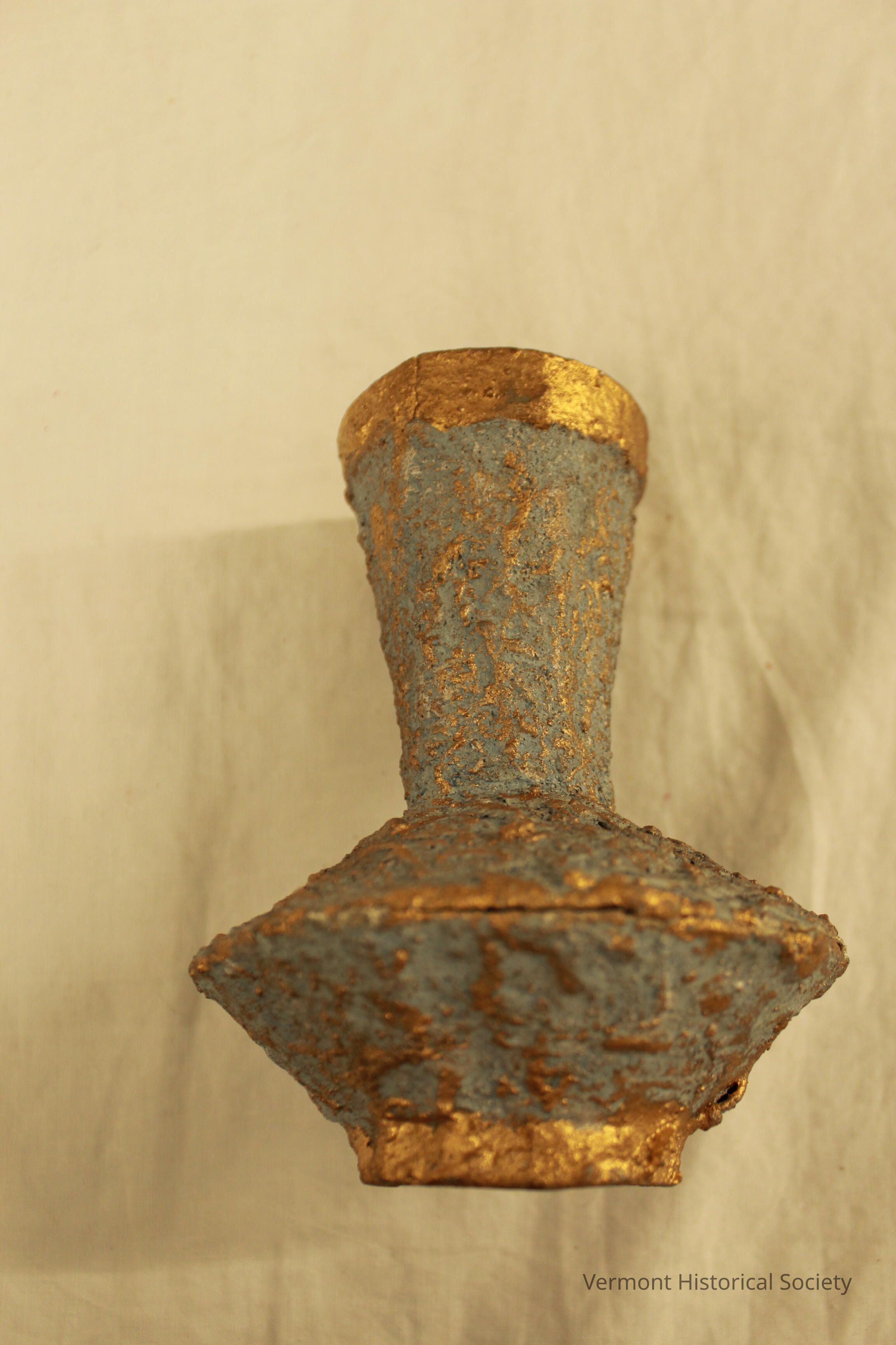 Papier mache vase made by children at the College Moderne et Technique in Montceau Les Mines. Vase has gray background, nubbly surface that is speckled in gold and gold rims and stripe at the base.