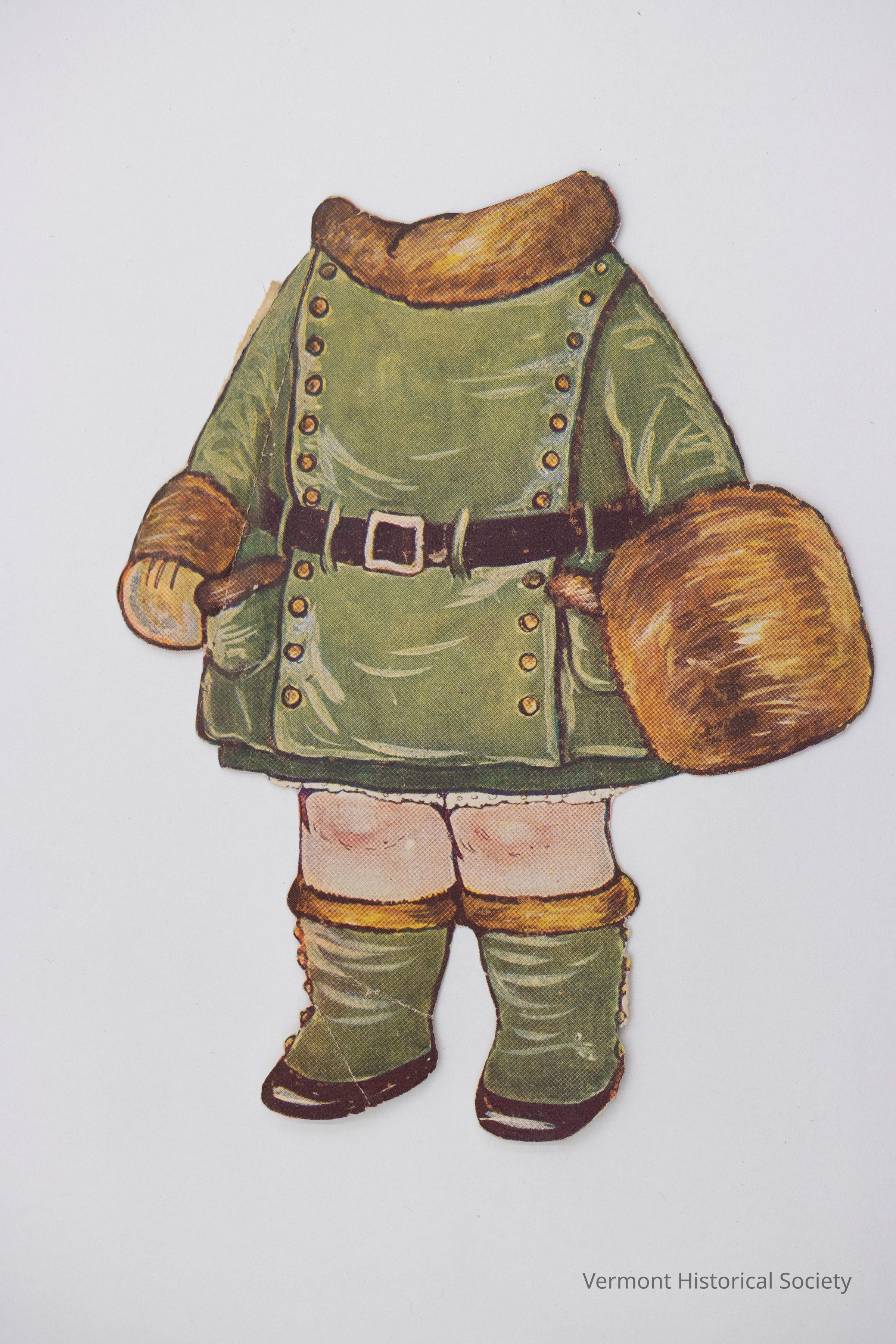 Printed paper dress for a paper doll. The dress consists of a fur-trimmed green coat, short green skirt, and green spats. The back shows a portion of a sales catalog page.Context