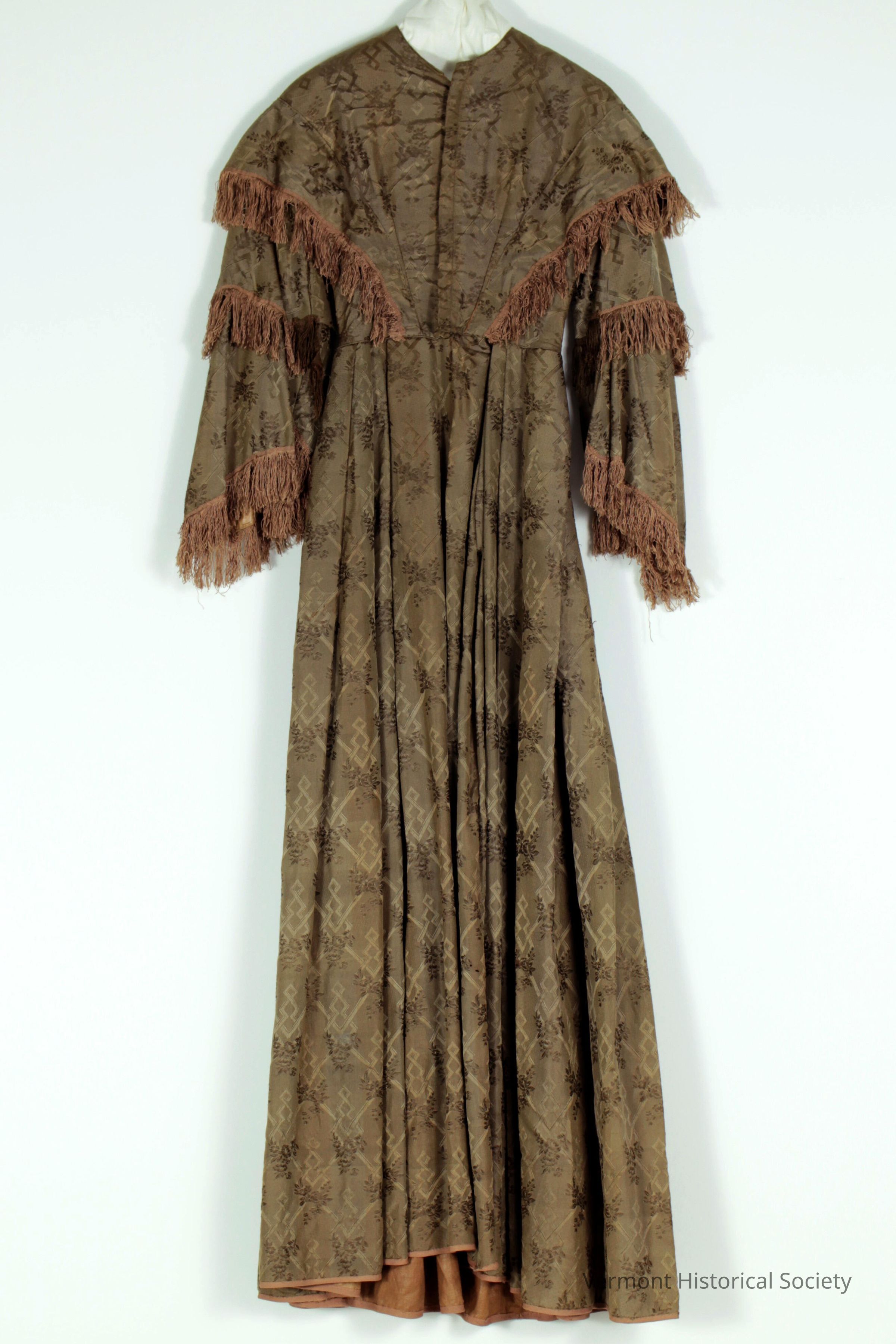 Brown figured silk dress trimmed with fringe. The bodice is fitted with panels that extend from the waist to the shoulders, extending over and past the armscye and trimmed with fringe. The wide, bell sleeves have an additional over sleeve ending above the wearer's elbow, both trimmed with fringe. The skirt is knife-pleated to the bodice, and the seam is trimmed with self piping. The silk is woven into a design of naturalistic roses, geometric key patterns, and diapering.