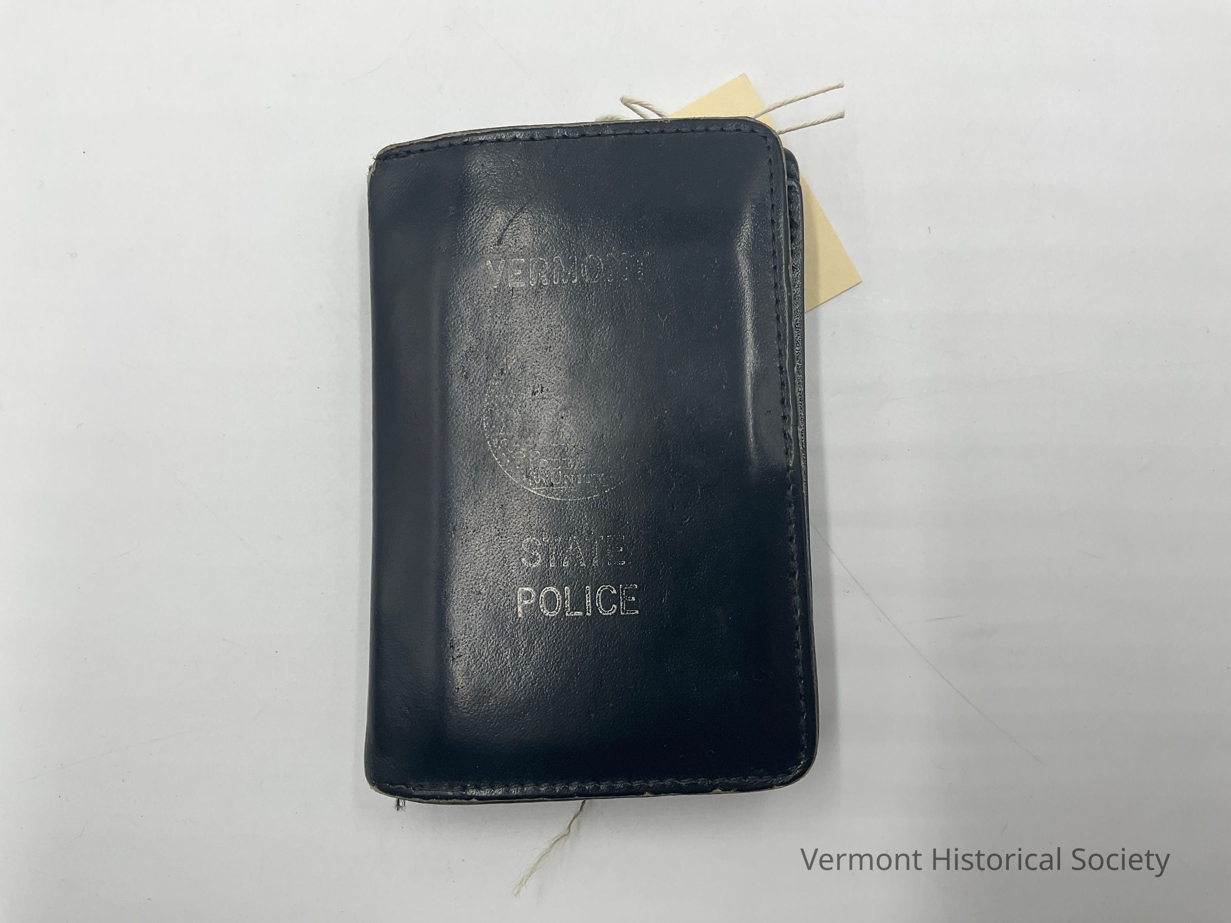 Black leather case that opens to show a silver metal badge and an identification card. The badge has the state seal in the center and the words, "Auxiliary Trooper, Vt." in silver on the front. The case opens to show an identification card that says, "Vermont State Police, Lindner, Brian S, Date issues 2018-01-18, Expires 2023-07-29, VSP Auxiliary Trooper. It includes a photo of Lindner and a State Police logo.Context