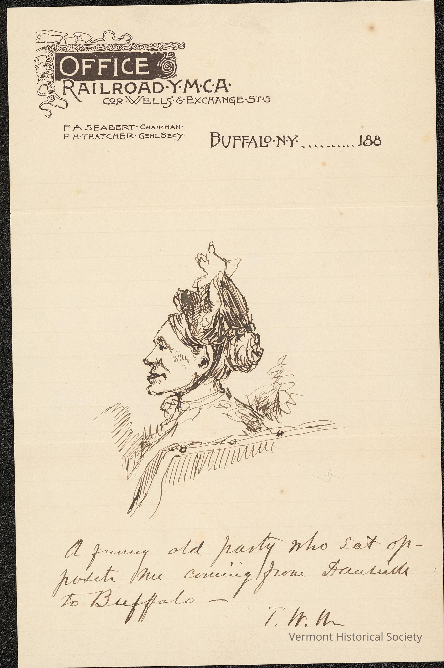Side view of a woman's head from the shoulders up. She is wearing a hat tied under her chin. Below the drawing is written, "A funny old party who sat opposite me coming from Danville to Buffalo-- T.W.W." The drawing is on stationery with a decorative header that reads, "OFFICE RAILROA.Y.M.C.A. Car Wells & Exchange St.3".Type of Drawing