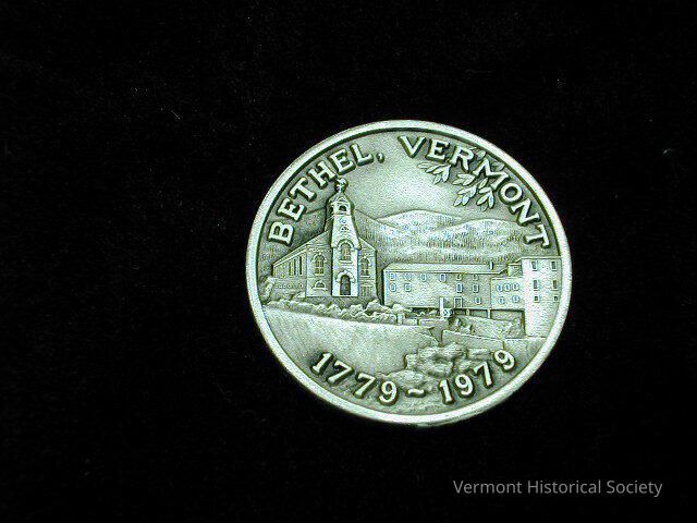 Commemorative medal molded with pictorial scenes on both sides. One side shows a church and a factory in front of mountains with the inscription, "BETHEL, VERMONT 1779-1979", around the edge. The other side shows a stag in a field with a jumping trout in the foreground and the inscription, "EAST BETHEL . CHRISTIAN HILL . LUMPUS . LILLIESVILLE . CAMP BROOK . GILEAD".Context