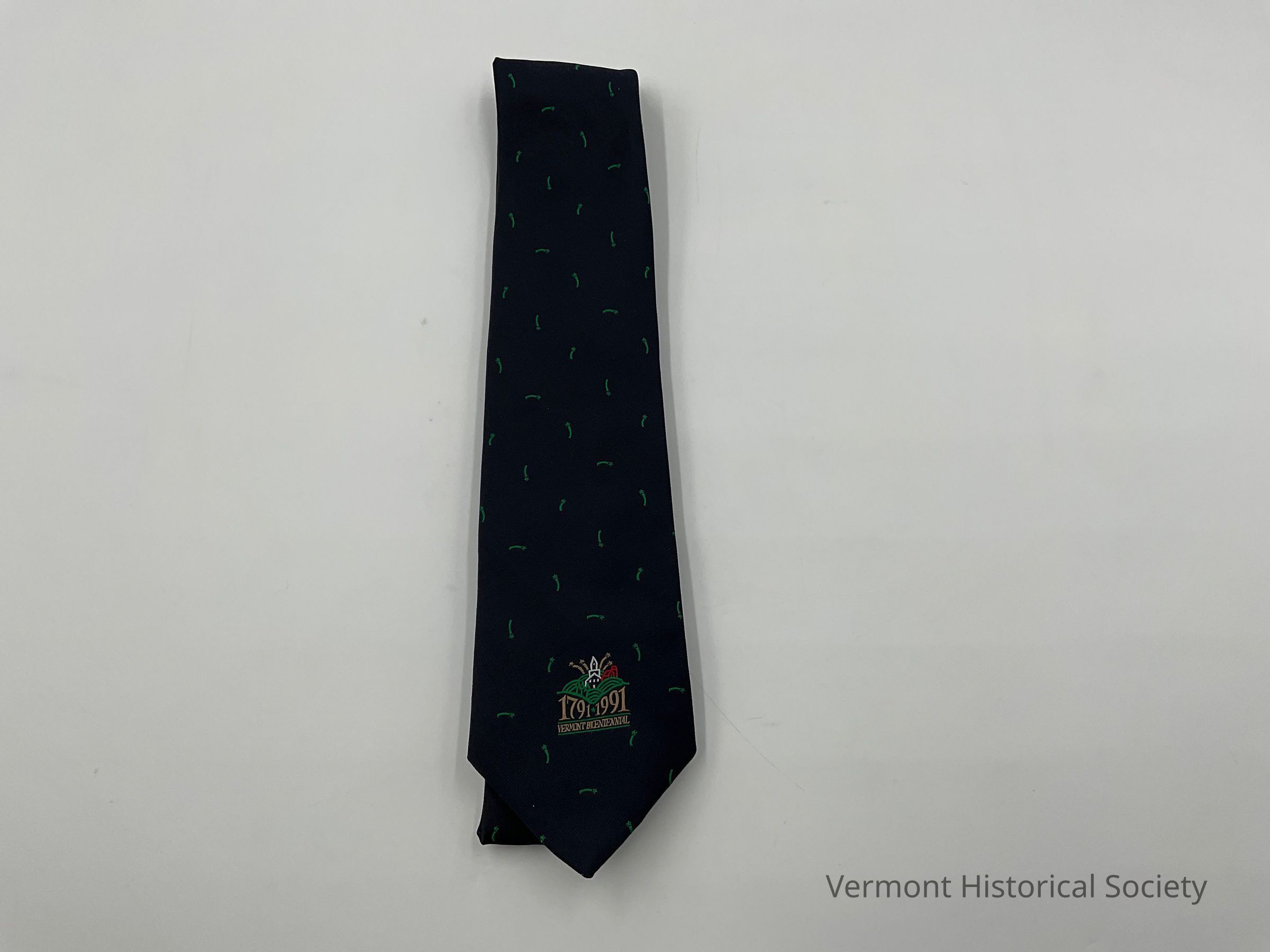 Blue necktie with green shooting stars and the Vermont Statehood Bicentennial logo at the center bottom.