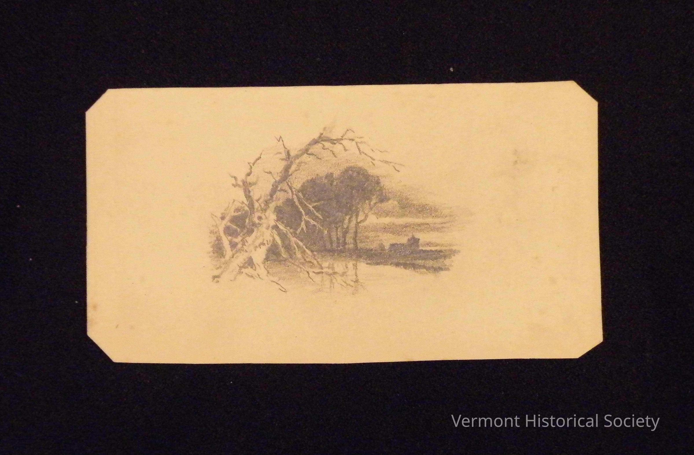 Landscape with leafless tree in left foreground, river and row of trees in middleground, and house in right background. on reverse in pencil is a portion of a letter in T.W. Wood's hand: "r Marshall, In think of disturbing your/____ of the "Pleasures of Solitude" by ____ appraising ____ you in propria personae./ few days. When we shall proceed to take/ by storm, as we are bent on having a/ for my dear/ fellow "pporpan to pucker" _____/ "Acquisition