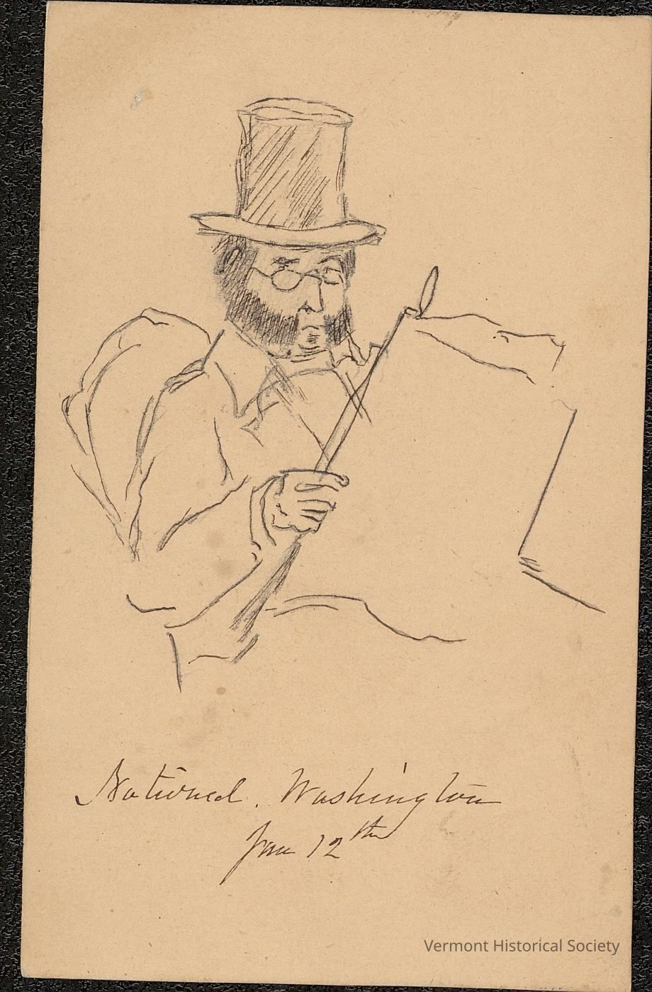Seated man reading a newspaper. Man wears a top hat and glasses. Washington D.C.