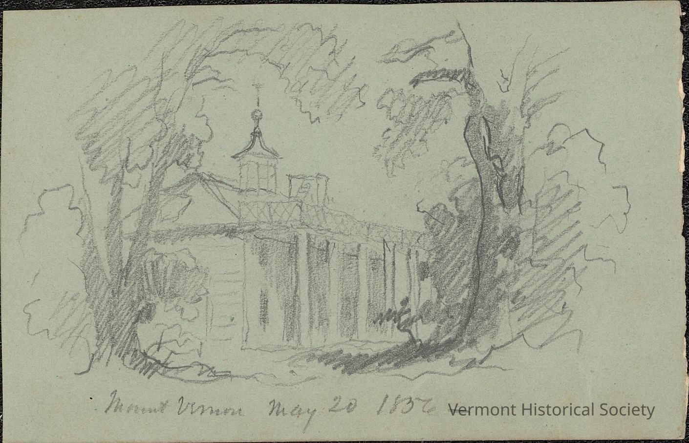 Oblique front view of Mount Vernon. Building is flanked by two large trees and other foliage. Mount Vernon, Va.Artwork Details