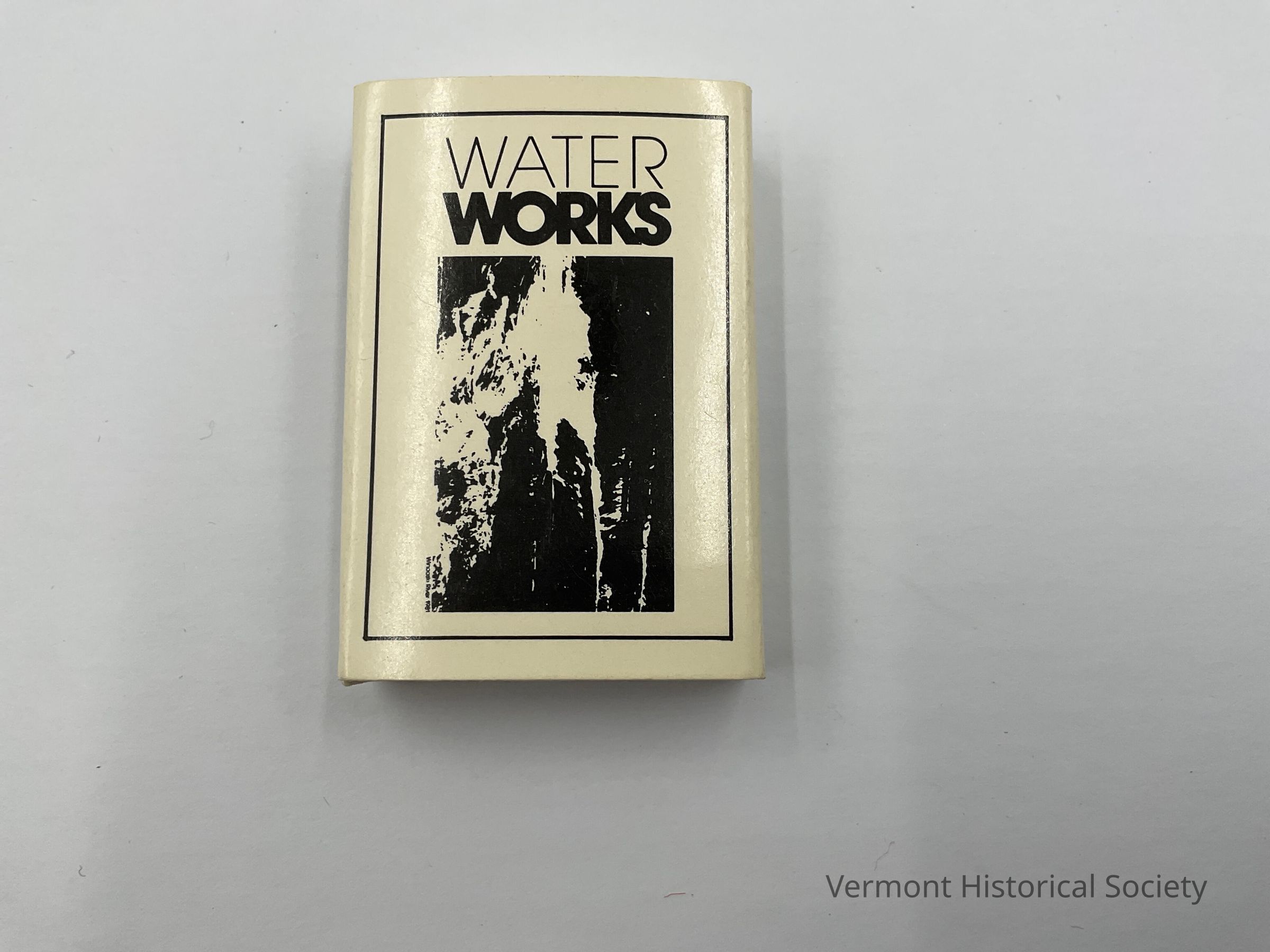 White box of pink tipped, wooden matches. Top of box has the image of a river -- the Winooski -- with the words, "Water Works." on the bottom is a promotional message printed in black that reads, "A warm environment for the enjoyment of fine food and drink." On the side is the address and phone - Champlain Mill, Winooski, Vermont, 655-2044. Under the strike strip is the manufacturing information: American Ace, by Universal Match Corp. Albany.Context