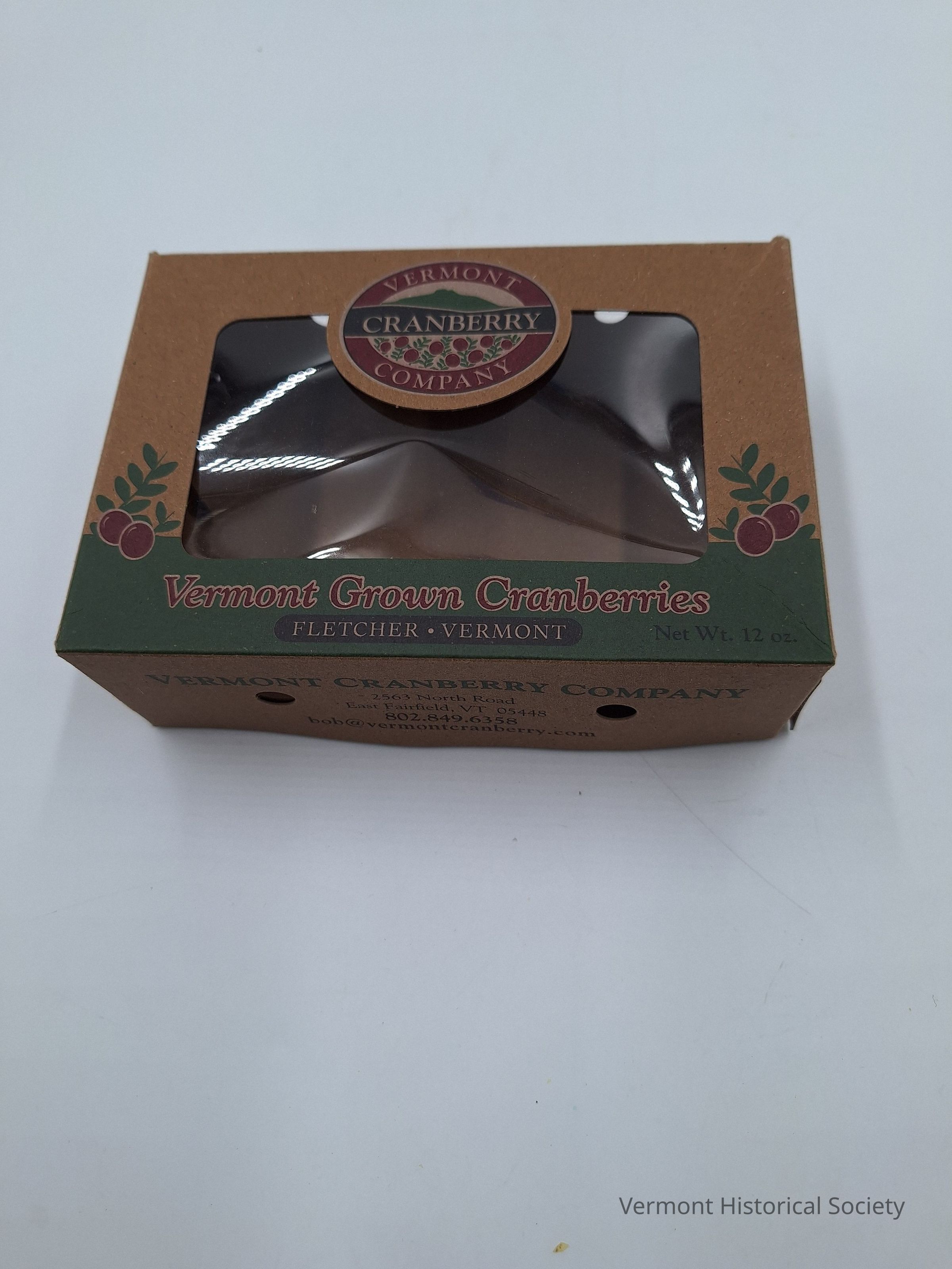 Cardboard box for Vermont Cranberry Company. The cardboard box is a natural brown color with round holes for ventilation in the front and back edges. There is a clear plastic cutout in the lid. The top center of the lid has a round logo printed for Vermont Cranberry Company featuring a green mountain and cranberries not he bush below it. The lower edge of the box top is printed green with "Vermont Grown Cranberries" in red script and "FLETCHER VERMONT" in white capital letters at the center. The front edge of the box is printed with the company's name, address, and contact information. The underside of the box has a printed recipe for a quick cranberry sauce.Context