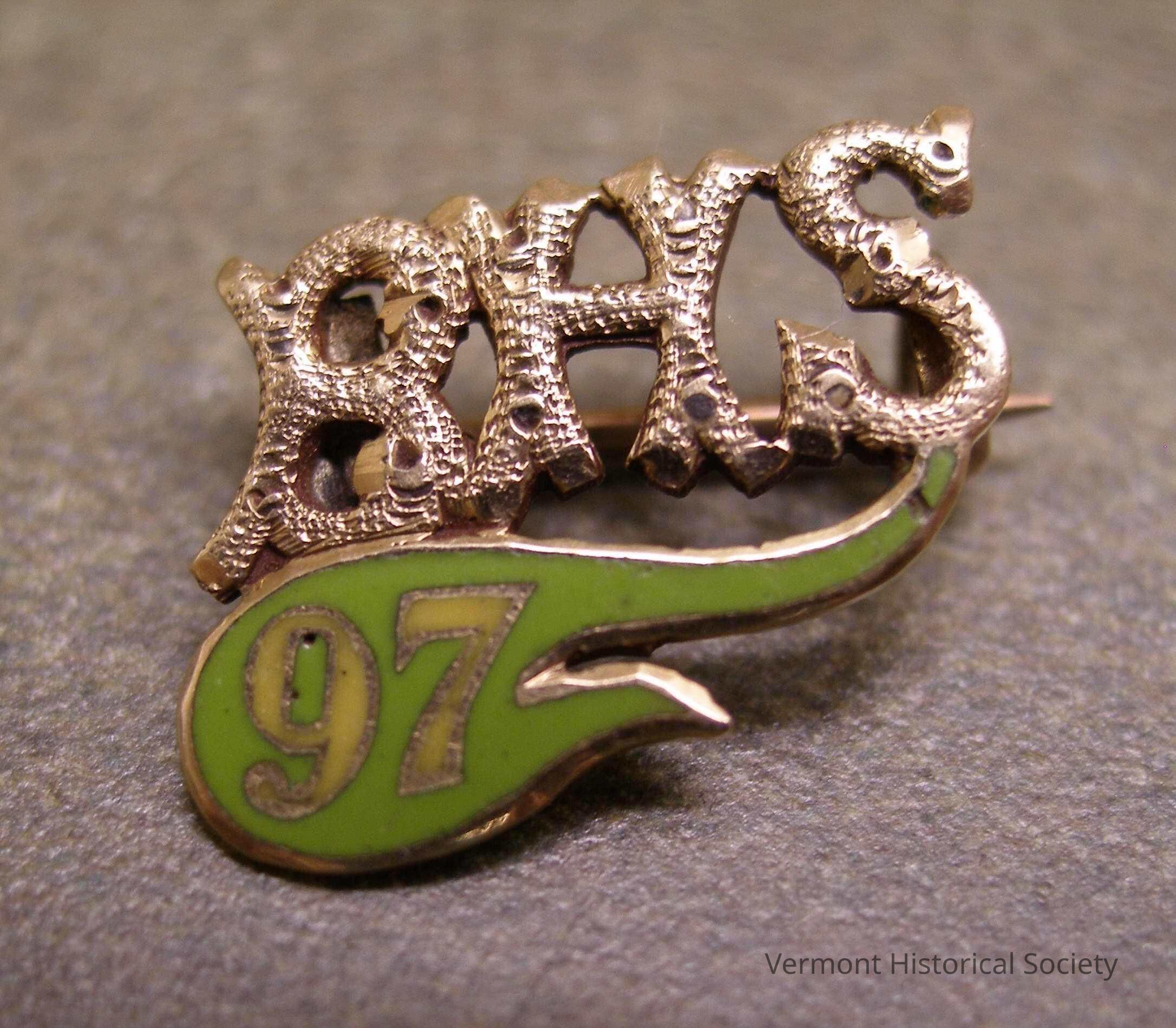 Class pin molded into the letters "BHS", styled to look like wooden branches. Beneath the letters is a green enameled flame with the yellow enameled number 97.