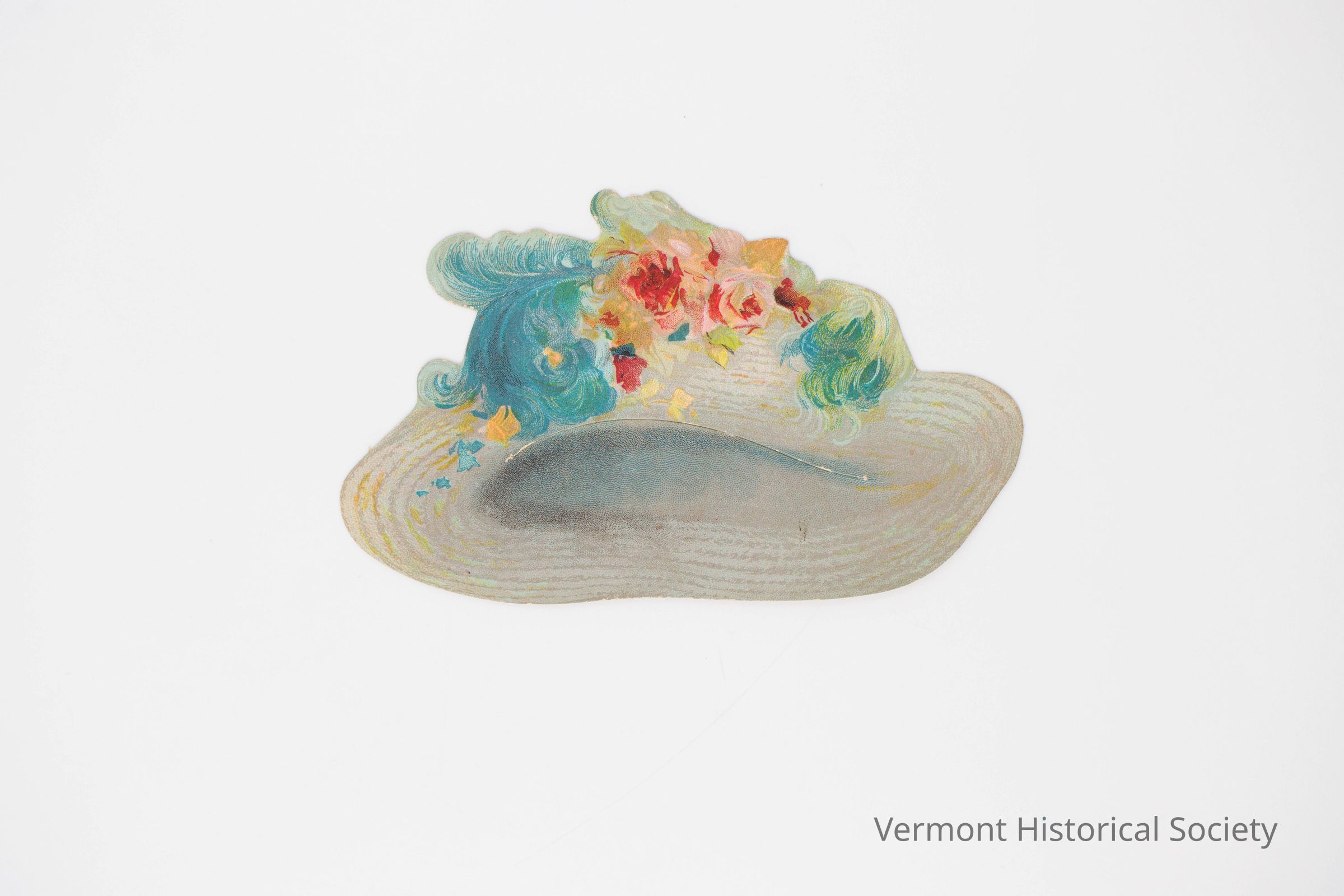 Paper doll hat with a wide, white brim decorated with pink flowers and blue feathers. There is a horizontal slit in the center for inserting the doll's head.