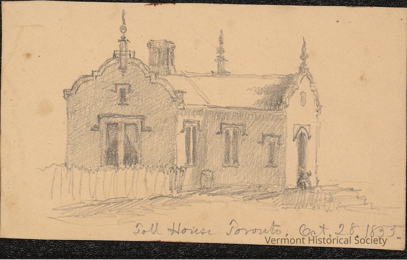 View of a 1 1/2 story building with hooded windows and pinnacles gables. Toronto.Artwork Details