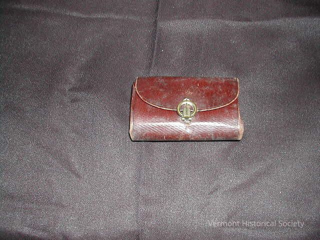 Small red leather wallet with a red lining. It secures with a metal clasp at the center of a front flap. The label, "Mary A. Templeton, Montpelier, Vt." is printed inside the from flap. There are calling cards inside.